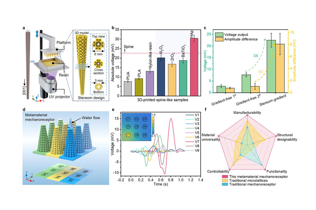 为验证这种结构是否具有普适性,研究团队利用光固化3D打印技术,制作出仿棘刺梯度多孔结构的高分子及陶瓷样品。实验结果显示,与没有梯度设计的样品相比,仿生梯度结构的电压输出提升约三倍,信号振幅增加约八倍,证明机电感知功能主要由拓朴结构驱动,而非材料本身的性质所决定。研究人员进一步构建了由多个梯度单元组成的仿生超材料机械传感器,该装置能够在水下实时探测水流方向与强度,并进行时间分辨的自我监测,无须额外的外置传感器或电源。