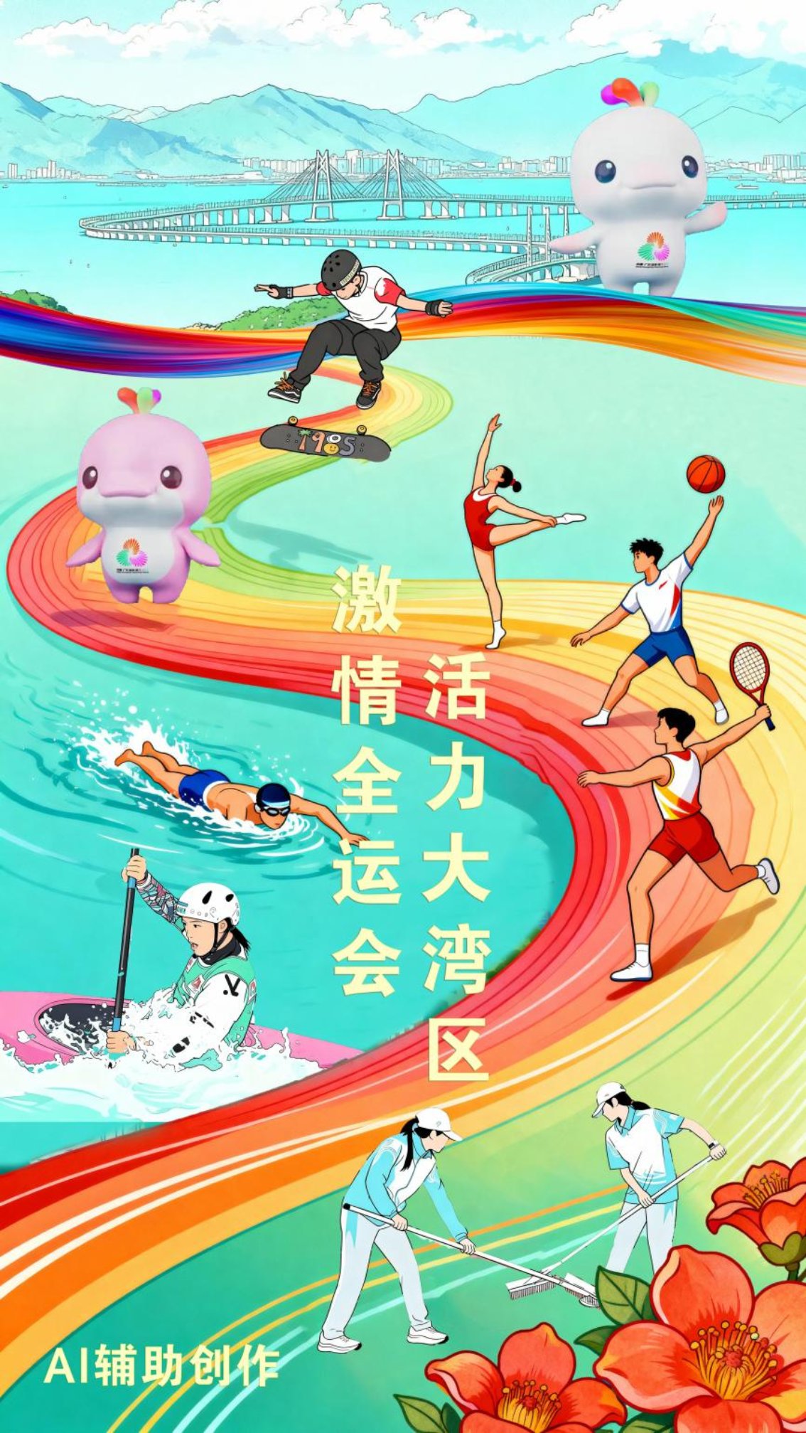 赛场内外,志愿者“小海豚”的身影同样动人。3万名广东赛区赛会志愿者以及近2万名香港、澳门赛区志愿者活跃在各个岗位,引导观众有序入场、协助运动员核对信息、为媒体提供服务保障、在高铁站对观众进行接送、在赛事间歇参与场地整理……身着“碧青绿”的“小海豚”,用专业的服务保障赛事顺畅进行,用真诚的微笑传递着大湾区的包容与热情。他们以青春之名赴时代之约,用点滴行动践行奉献担当,释放蓬勃向上的青春力量,也让全运会的温暖在每一个服务细节中悄然传递。