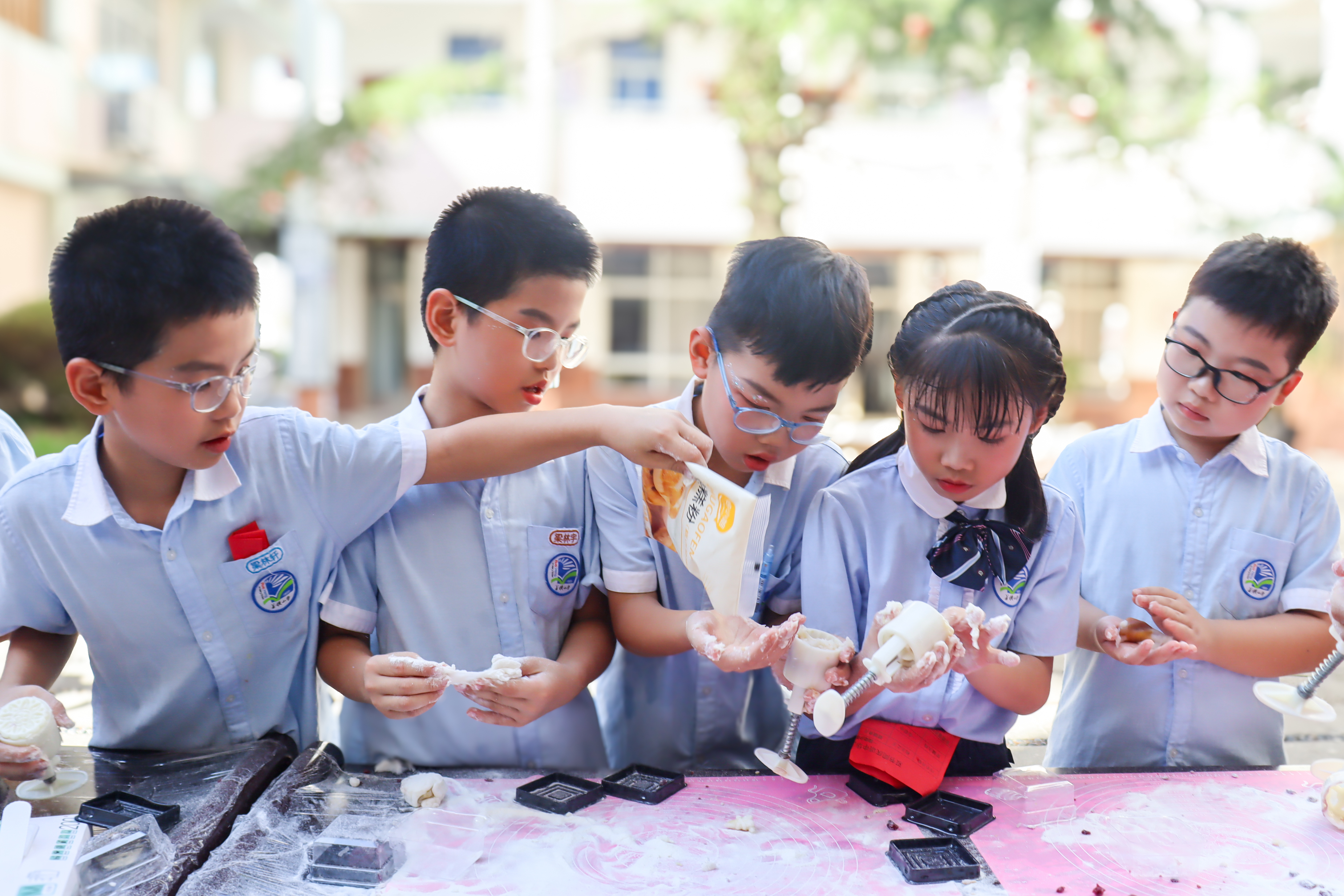 随后的体验环节将校园操场变成非遗工坊与红色主题互动区,共设置15个体验项目。学生们在“巧手月饼”中亲手制作中秋味道,体会团圆之情;在“非遗锡纸浮雕”“泥塑兔儿爷”“中国结编织”“扎染工艺”等项目中,近距离感受传统手工艺的精妙;通过“嫦娥奔月”“齐心协力”“枪王之王”等互动游戏,锻炼团队协作与反应能力;在“重温爱国情”“红船领航”“巧运军粮”等红色主题教育项目中,深刻感悟党史历程与民族精神。活动现场气氛热烈,同学们穿梭于各个展区之间,踊跃参与、积极体验,在动手实践中不仅收获了知识与技能,更深刻感受到中华文化的深厚底蕴与时代活力。