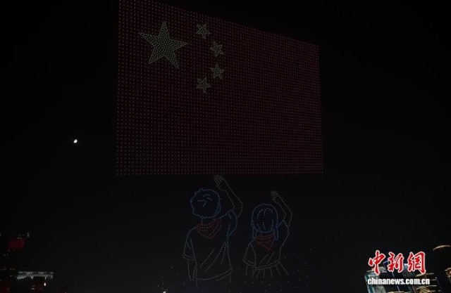 图为无人机在空中 “织” 出五星红旗图案。中新社记者 周毅 摄