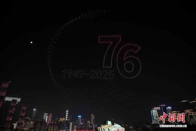 图为无人机空中描绘出“76”与“1949-2025”图案,祝福祖国生日快乐。中新社记者 周毅 摄