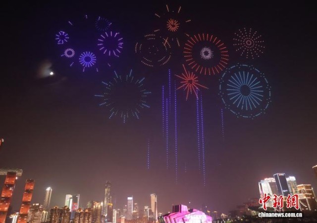 图为无人机“数字烟花”绽放夜空。中新社记者 周毅 摄