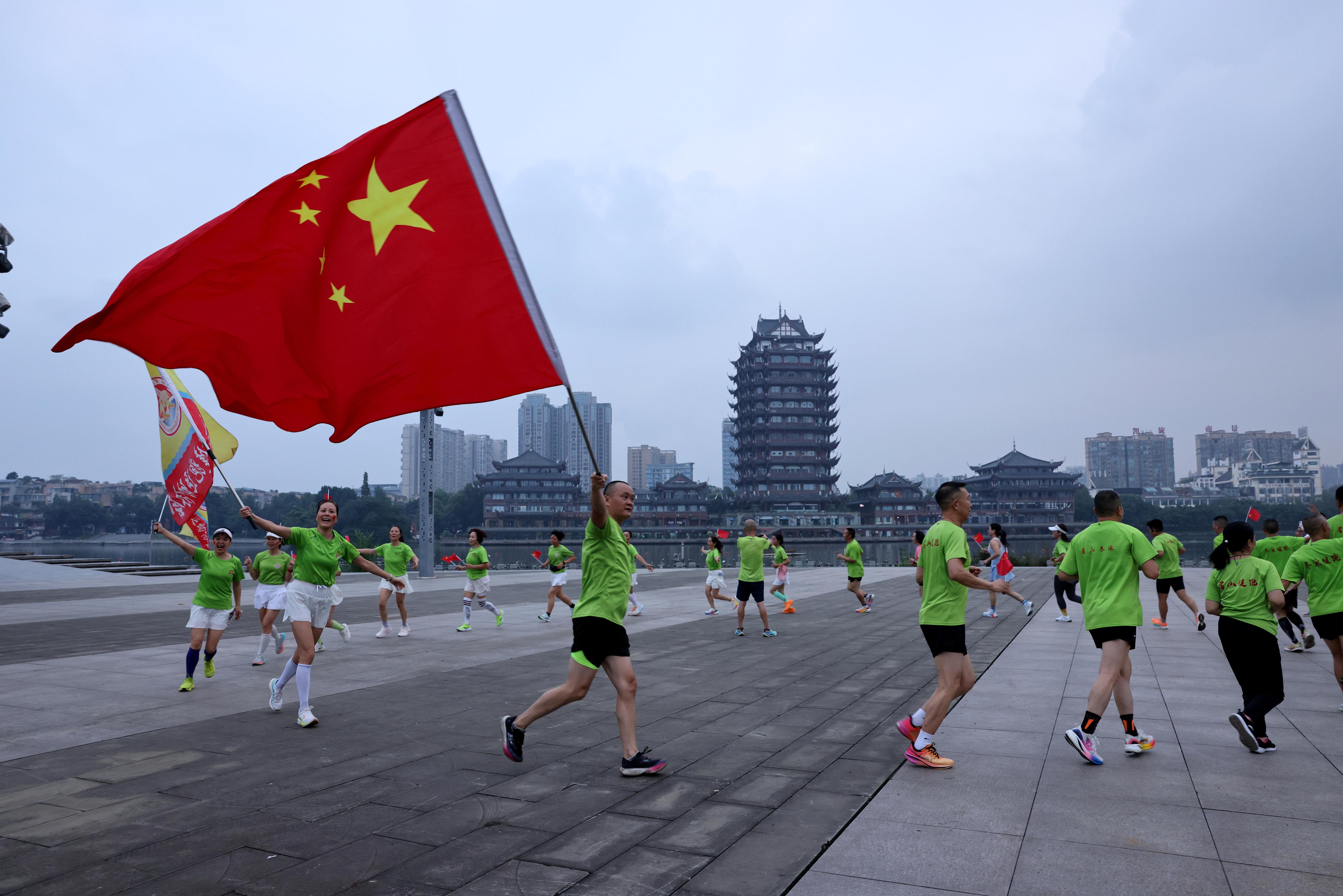 10月1日,在四川省眉山市东坡城市湿地公园,健跑爱好者参加庆祝祖国华诞的“10.01公里”长跑活动。