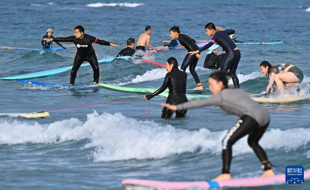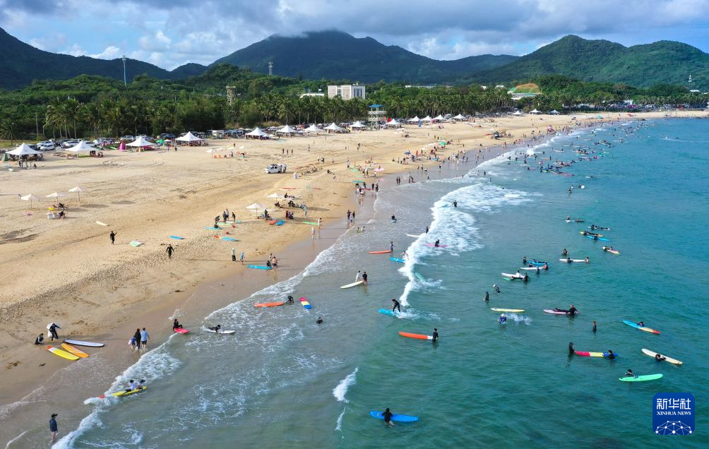 10月2日,游客在海南万宁日月湾冲浪。
