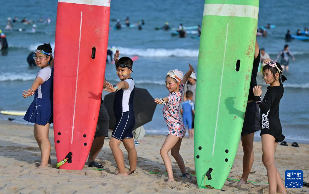 10月2日,准备体验冲浪的小朋友在海南万宁日月湾合影留念。