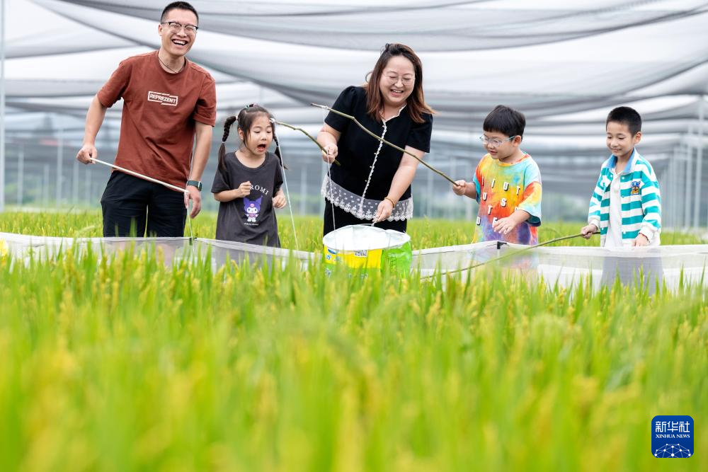 10月3日,游客在浙江省湖州市长兴县夹浦镇的“稻蛙共生”循环生态种养基地体验垂钓。