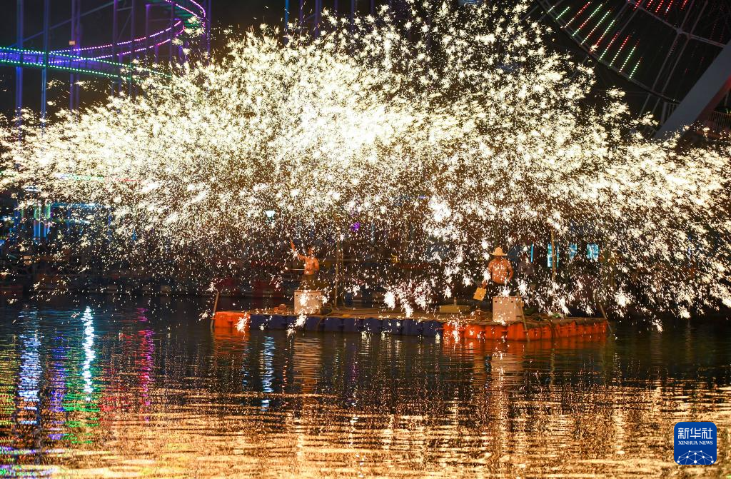 10月2日,非遗传承人在江苏南京七桥瓮湿地公园内展示打铁花技艺。