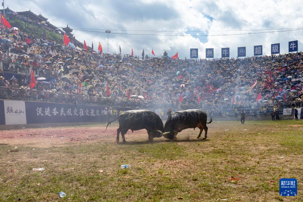 10月2日,观众在贵州省黔东南苗族侗族自治州从江县丙妹镇松学斗牛塘观看斗牛。