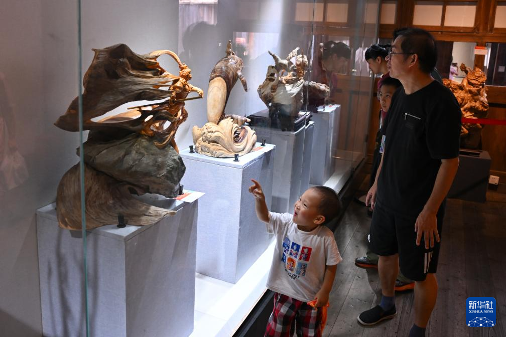 10月2日,游客在福州三坊七巷内参观木雕展品。