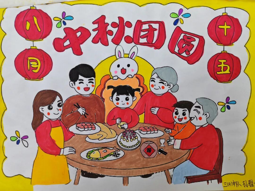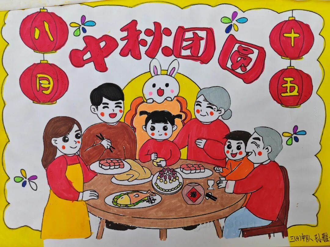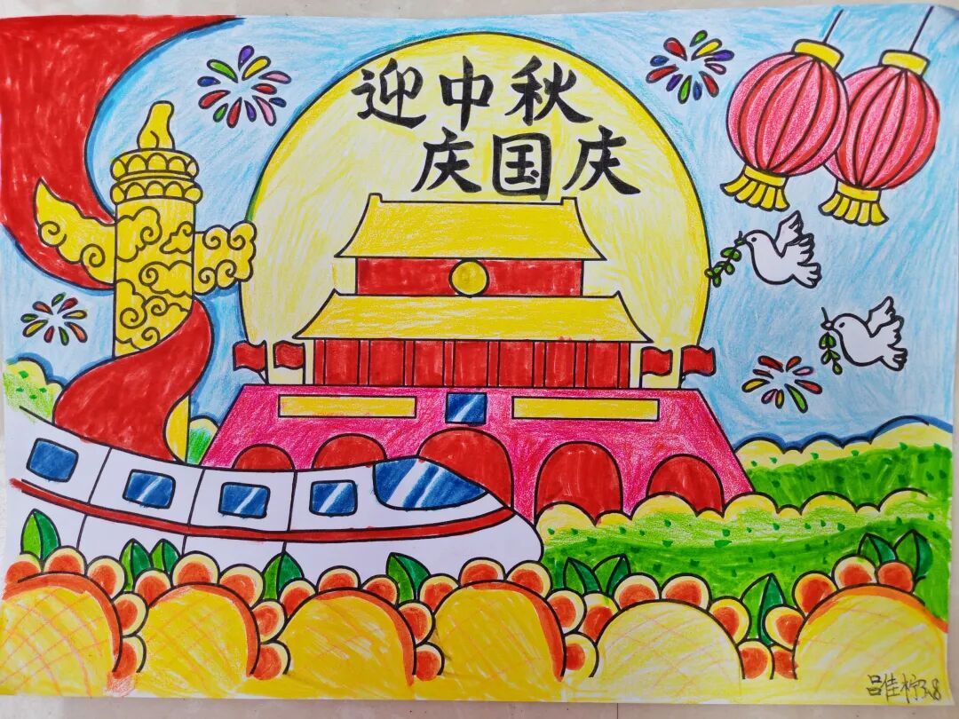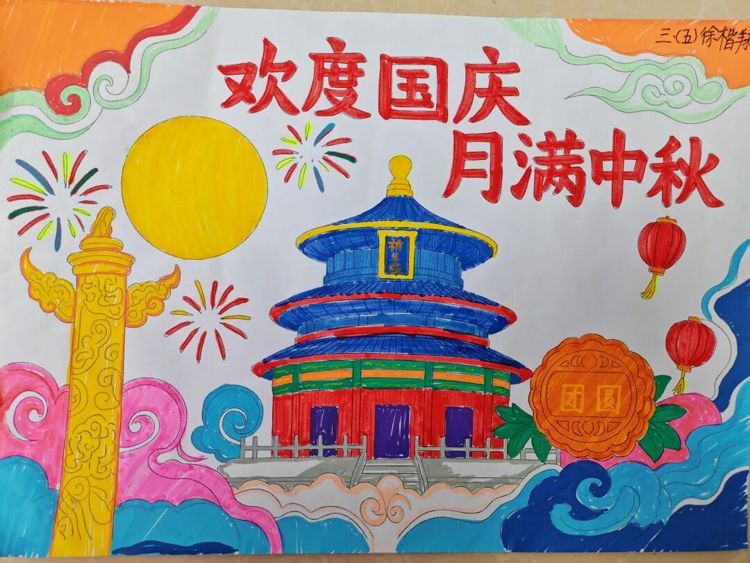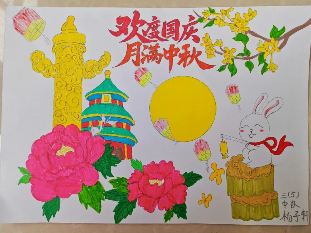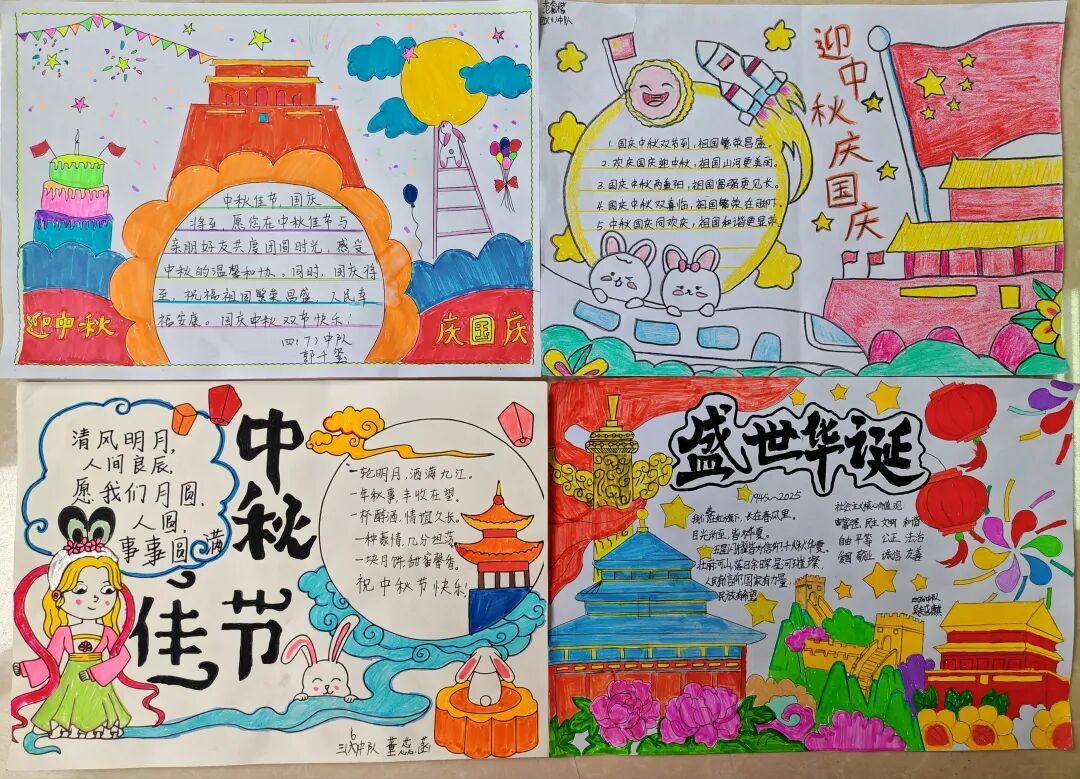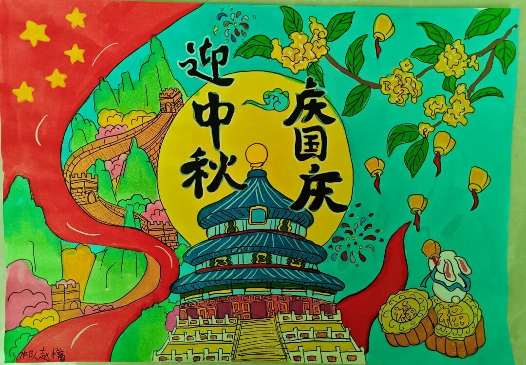三年级队员以画笔为媒,描绘祖国的壮丽山河与中秋的温馨团圆。长城、故宫、明月、家宴……一幅幅色彩斑斓的绘画作品,展现了队员们对祖国强盛,家人团圆的美好祝愿。
