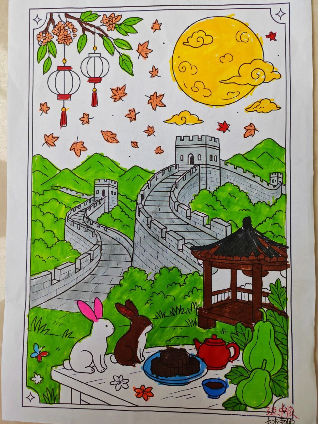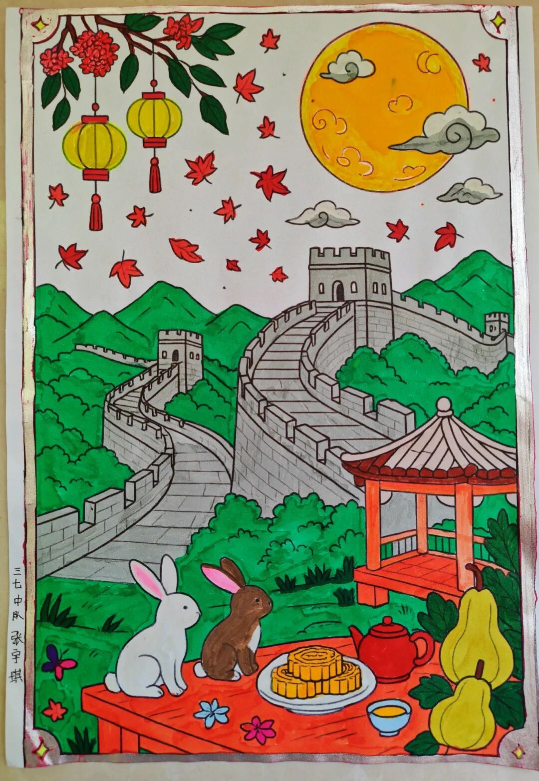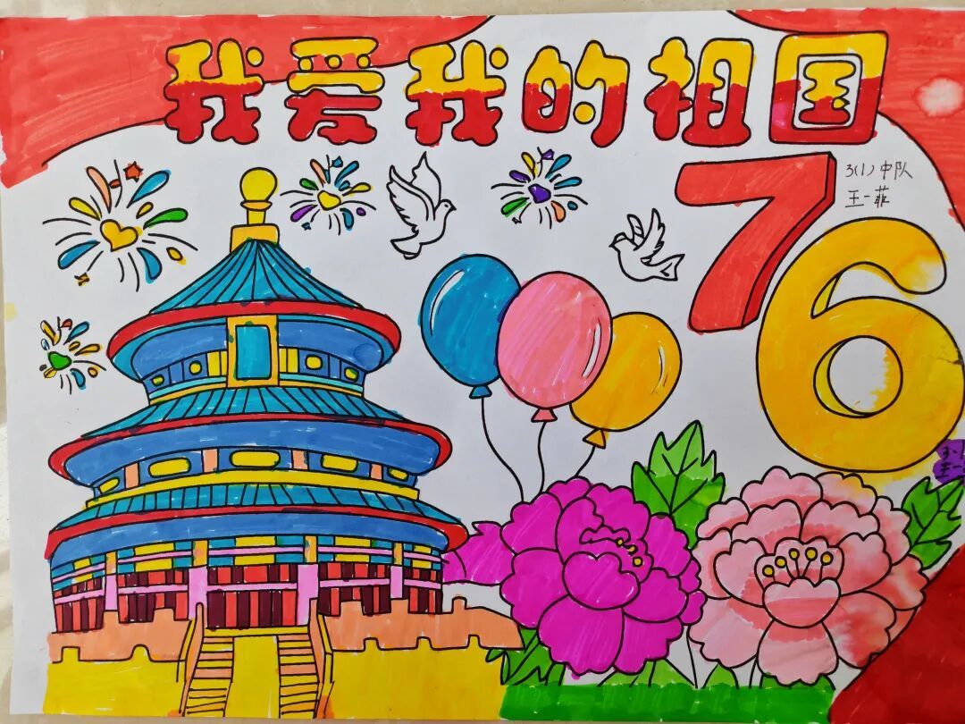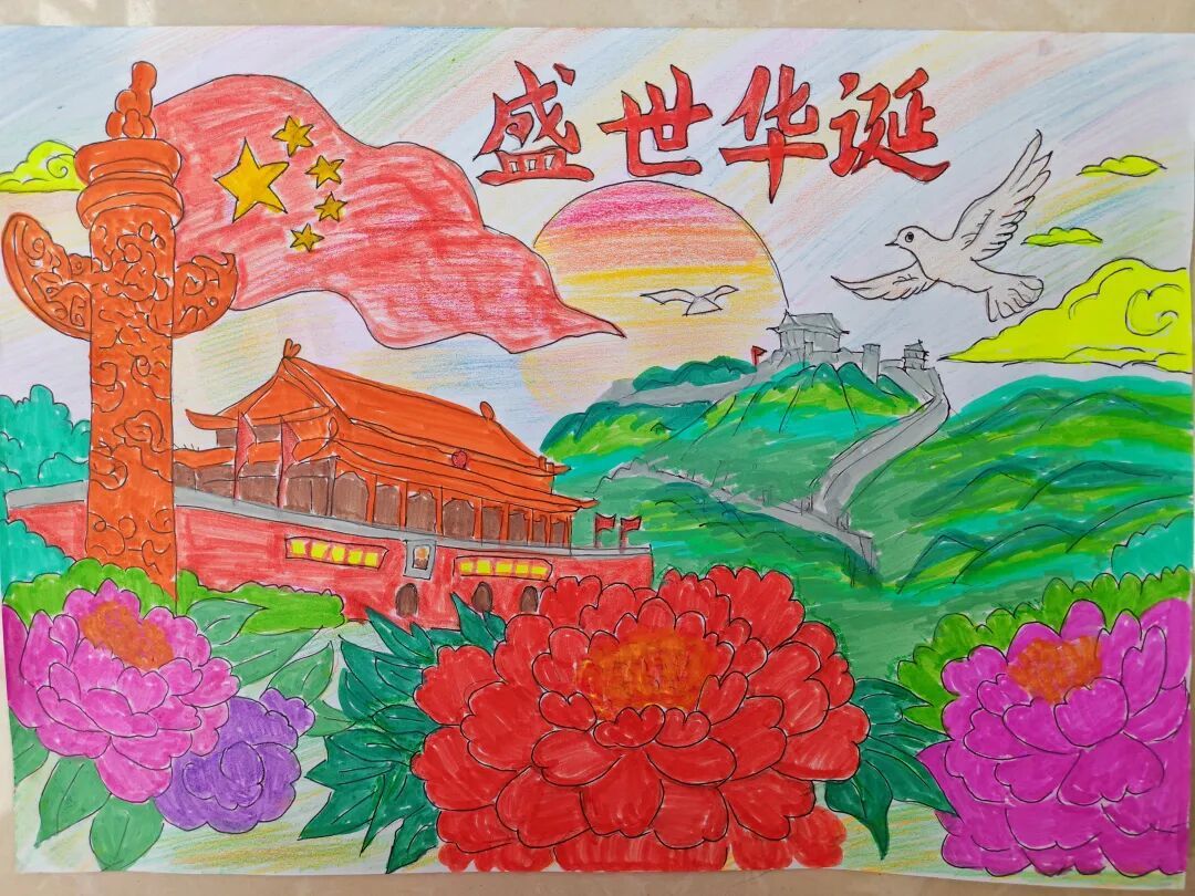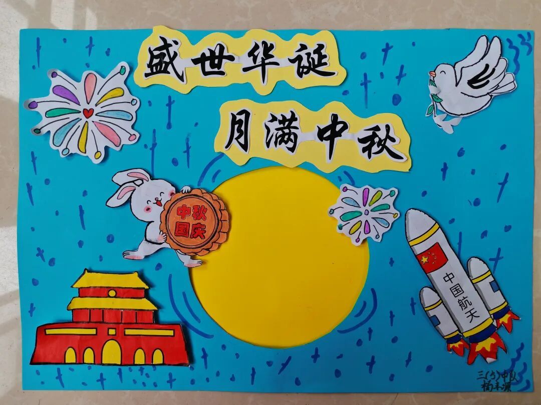 三年级队员以画笔为媒,描绘祖国的壮丽山河与中秋的温馨团圆。长城、故宫、明月、家宴……一幅幅色彩斑斓的绘画作品,展现了队员们对祖国强盛,家人团圆的美好祝愿。