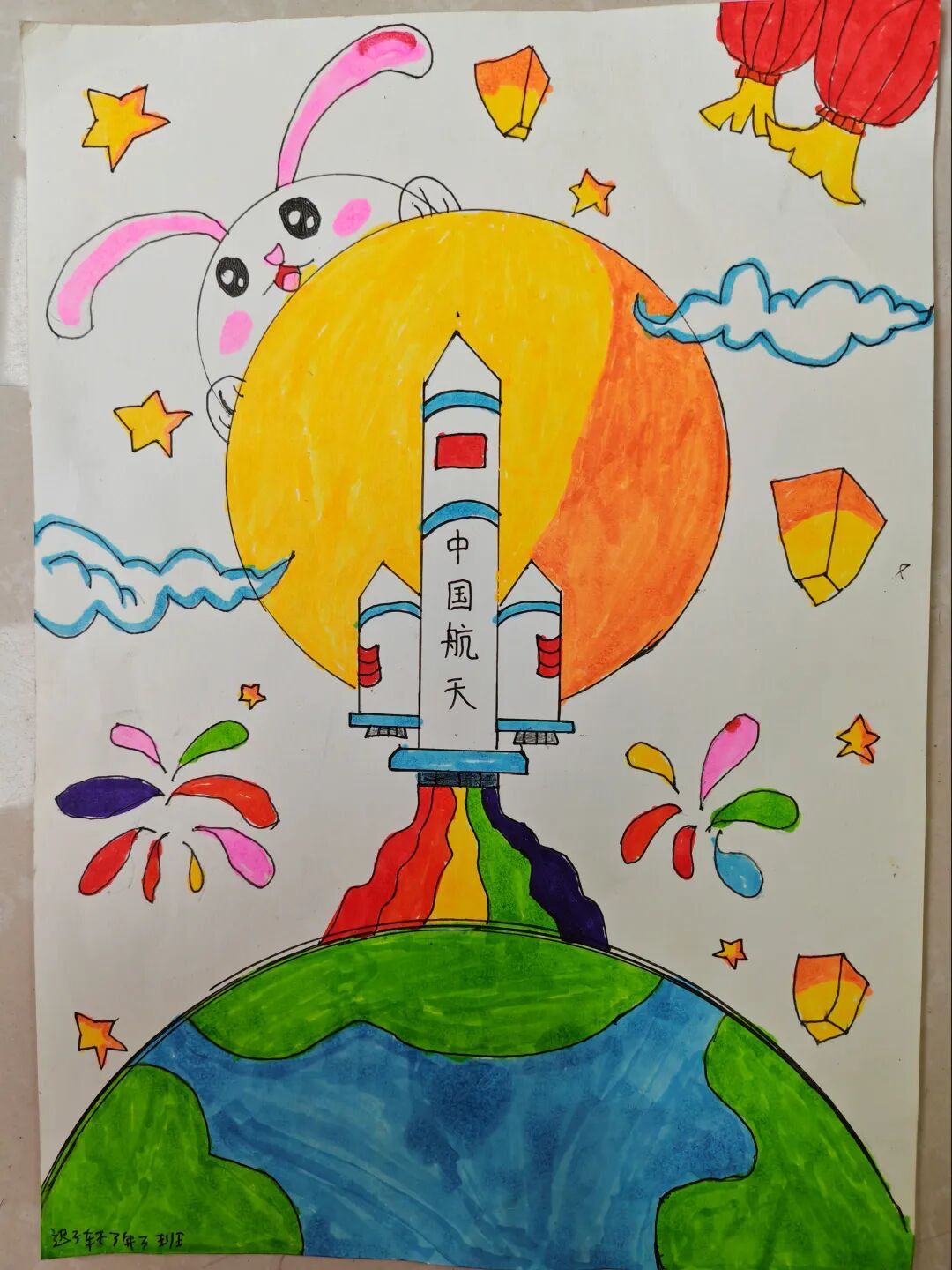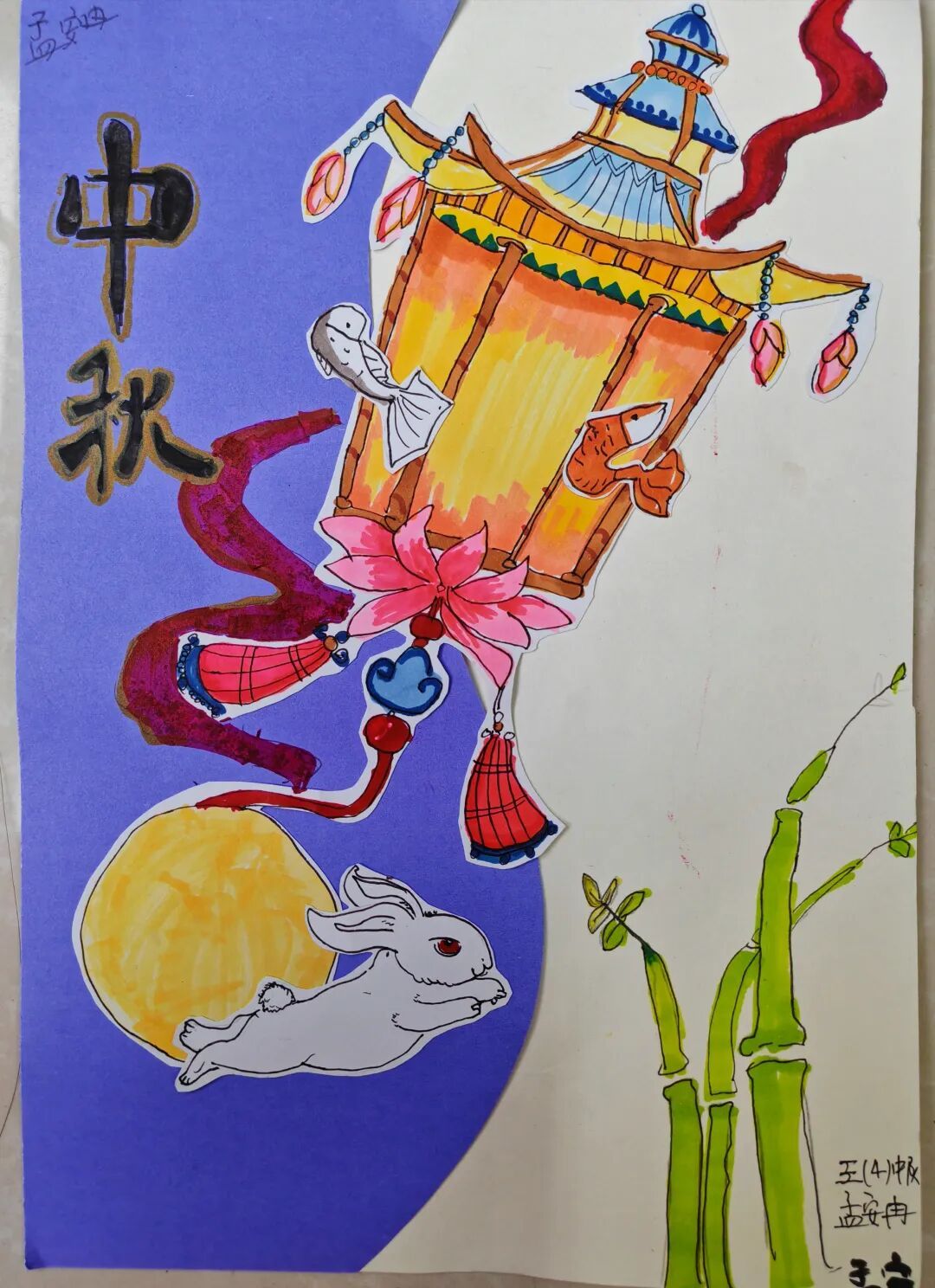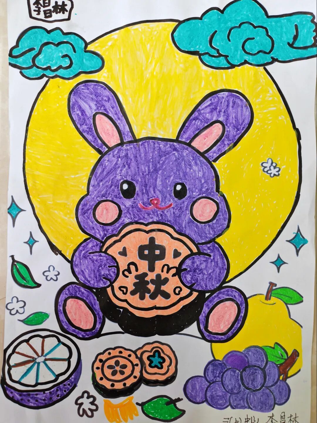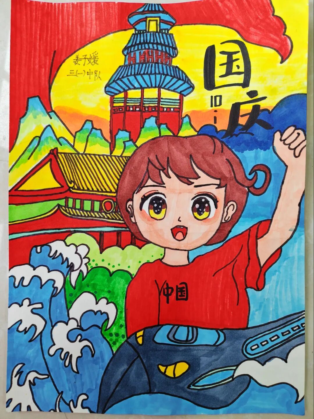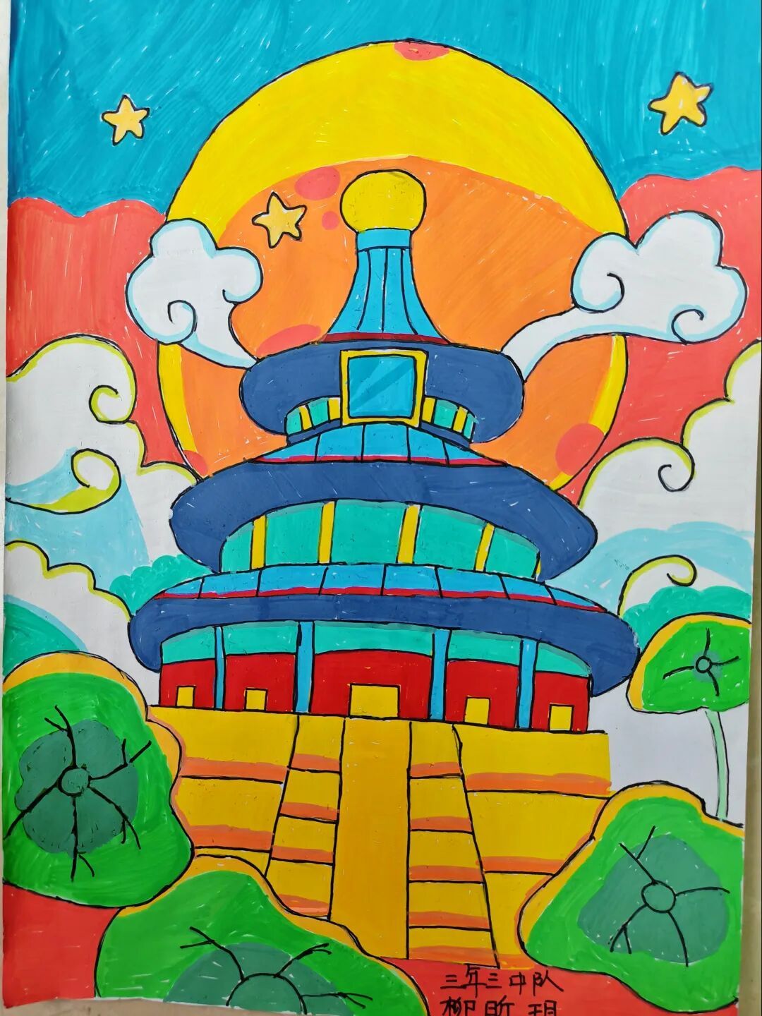 三年级队员以画笔为媒,描绘祖国的壮丽山河与中秋的温馨团圆。长城、故宫、明月、家宴……一幅幅色彩斑斓的绘画作品,展现了队员们对祖国强盛,家人团圆的美好祝愿。