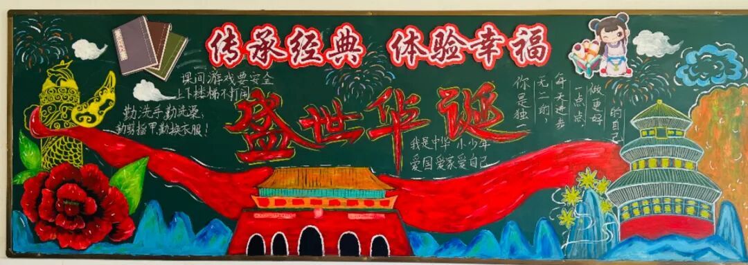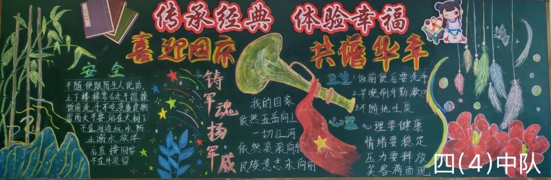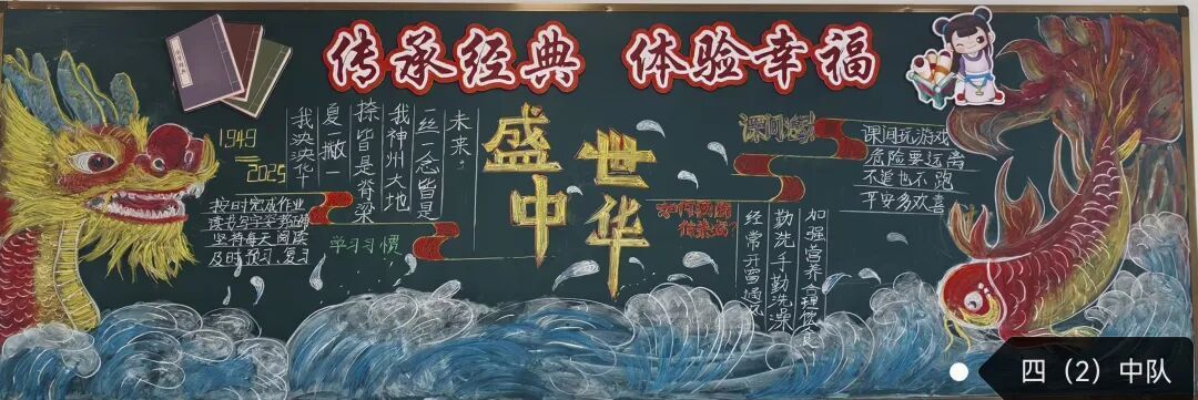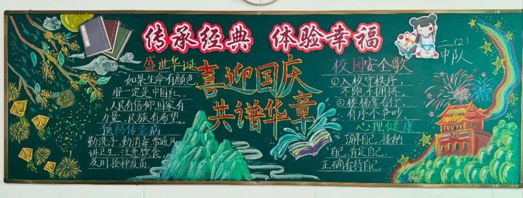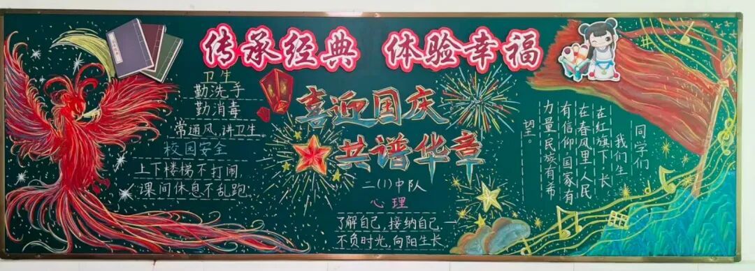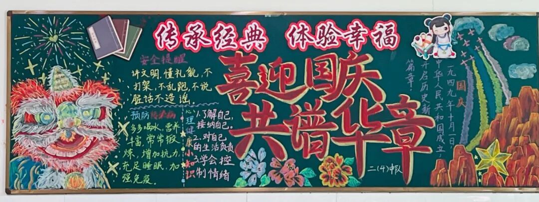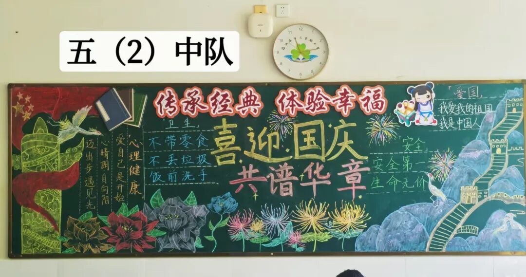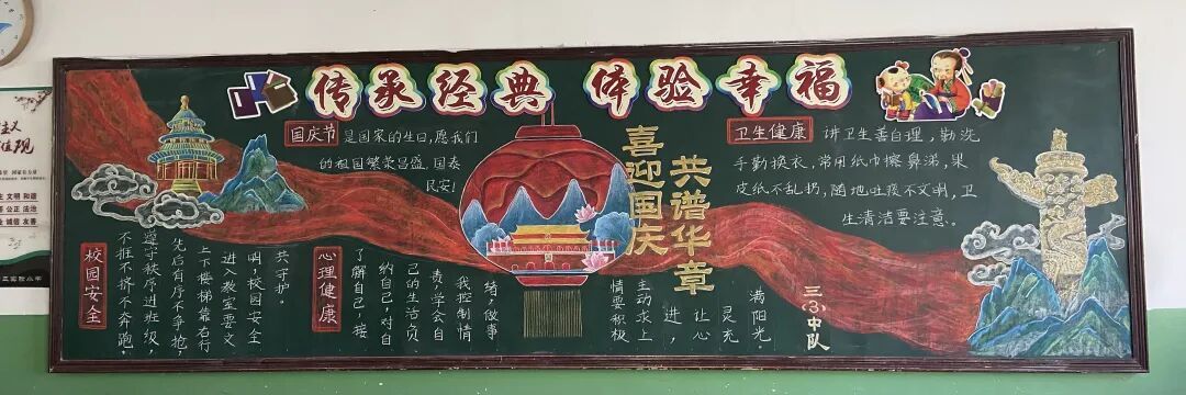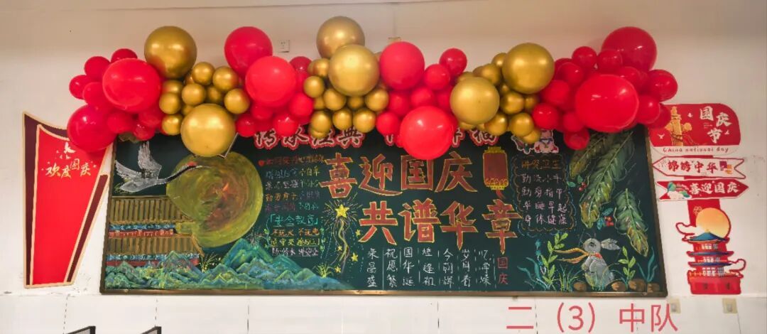 此外,各中队还精心布置了以“国庆”为主题的黑板报。板报内容丰富多彩,既有国旗、天安门等元素,也有爱国名言、节日祝福等文字内容,营造出浓厚的节日氛围,成为中队一道亮丽的风景线。 此次系列活动不仅丰富了队员的课余生活,更在潜移默化中增强了队员的民族自豪感和文化认同感。福山区第三实验小学将继续以德育为根、以文化为魂,培养有理想、有担当的新时代好队员!
