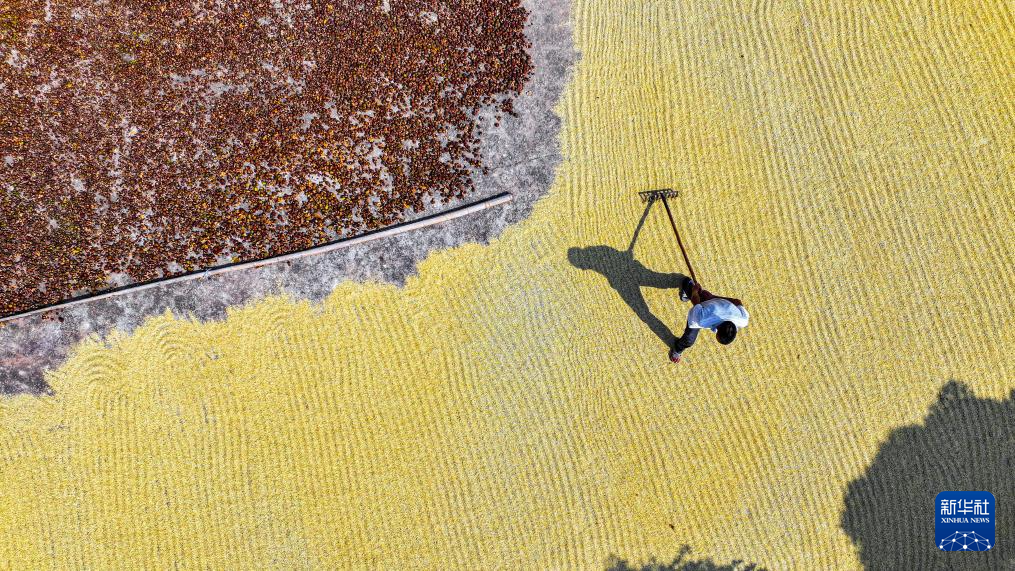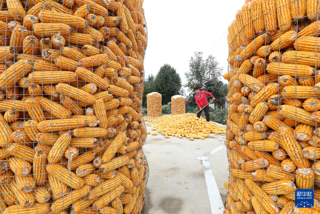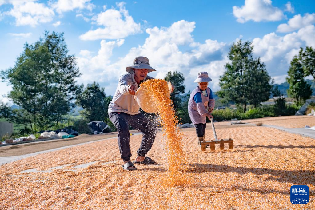 10月11日,云南省文山壮族苗族自治州广南县莲城镇那朵村的农民在晾晒收获的玉米。