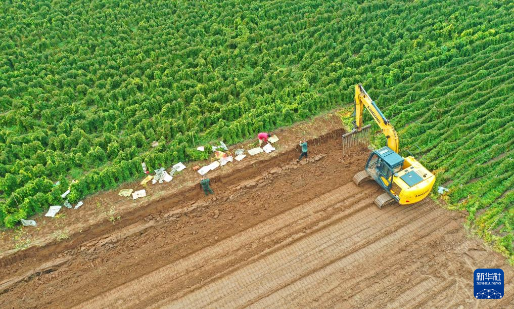 10月11日,河南省焦作市孟州市城伯镇西后津村农民在田间抢收铁棍山药(无人机照片)。