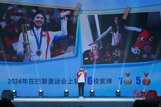 10月12日晚,江苏南京,“把青春华章写在祖国大地上”活动现场,奥运冠军张雨霏到场和青年朋友们见面。她说,听到河海大学校长讲述一代代河海人治水的故事,自己也感觉热血沸腾。她说:“水是我们共同的老师,它教会我们刚柔并济、积蓄力量,也教会我们中流击水、勇立潮头。”中青报·中青网记者 田嘉硕/摄