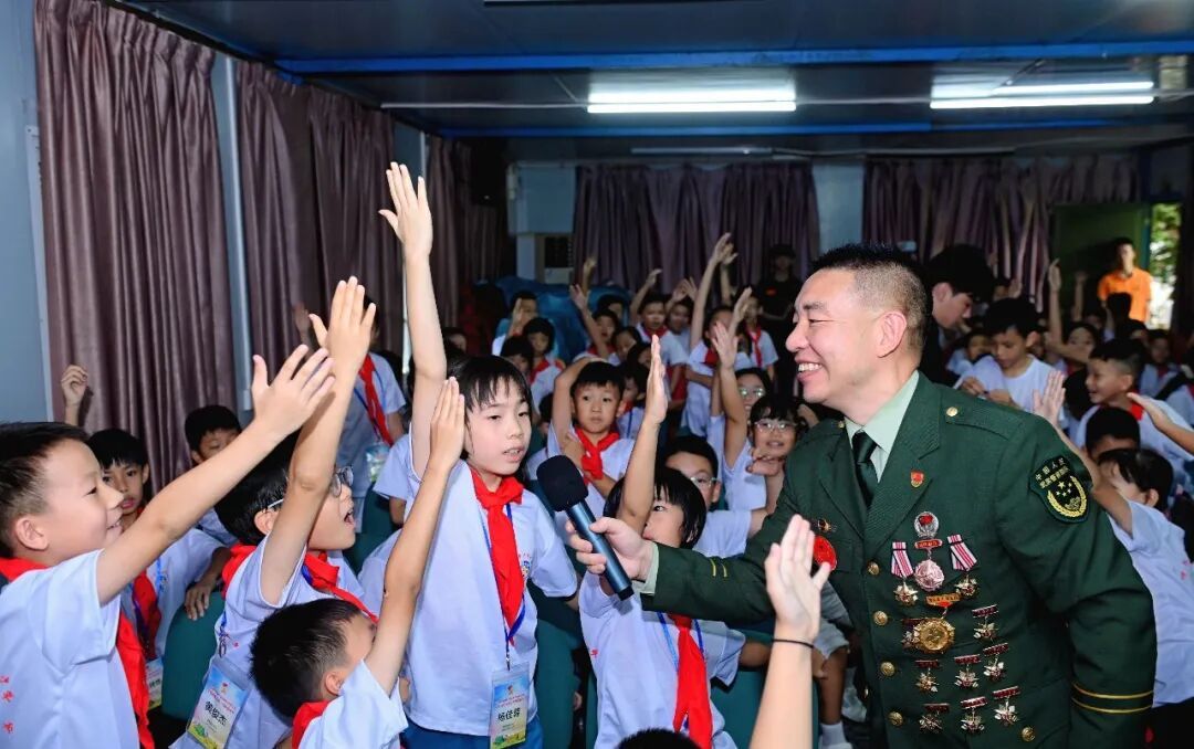 中山市“戎耀香山老兵宣讲工作室”负责人、中山市最美退役军人梁华为少先队员授课,少先队员踊跃回答国防问题