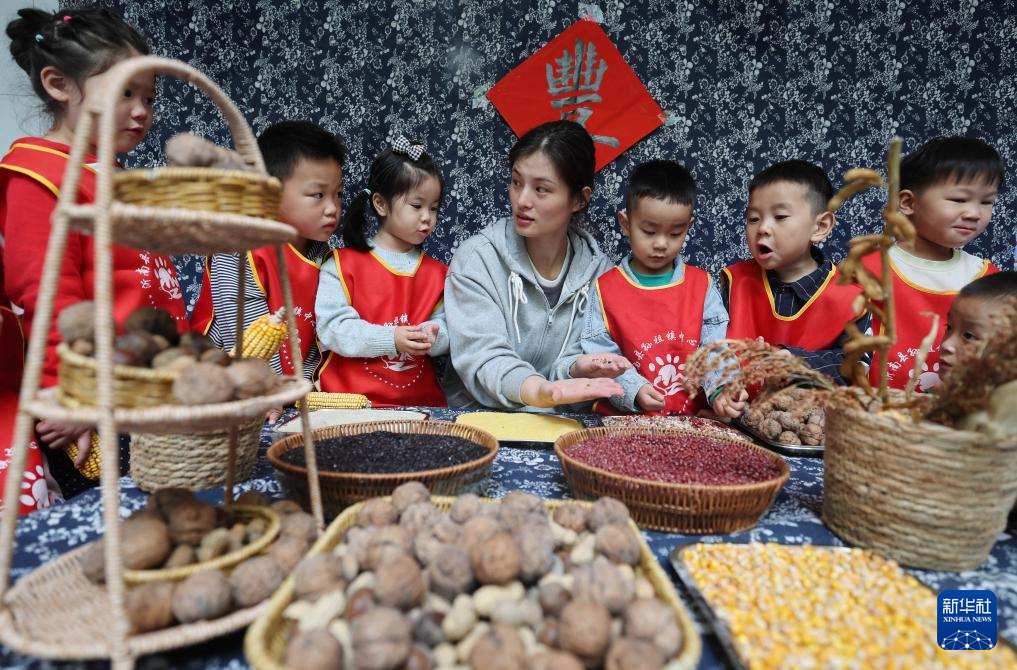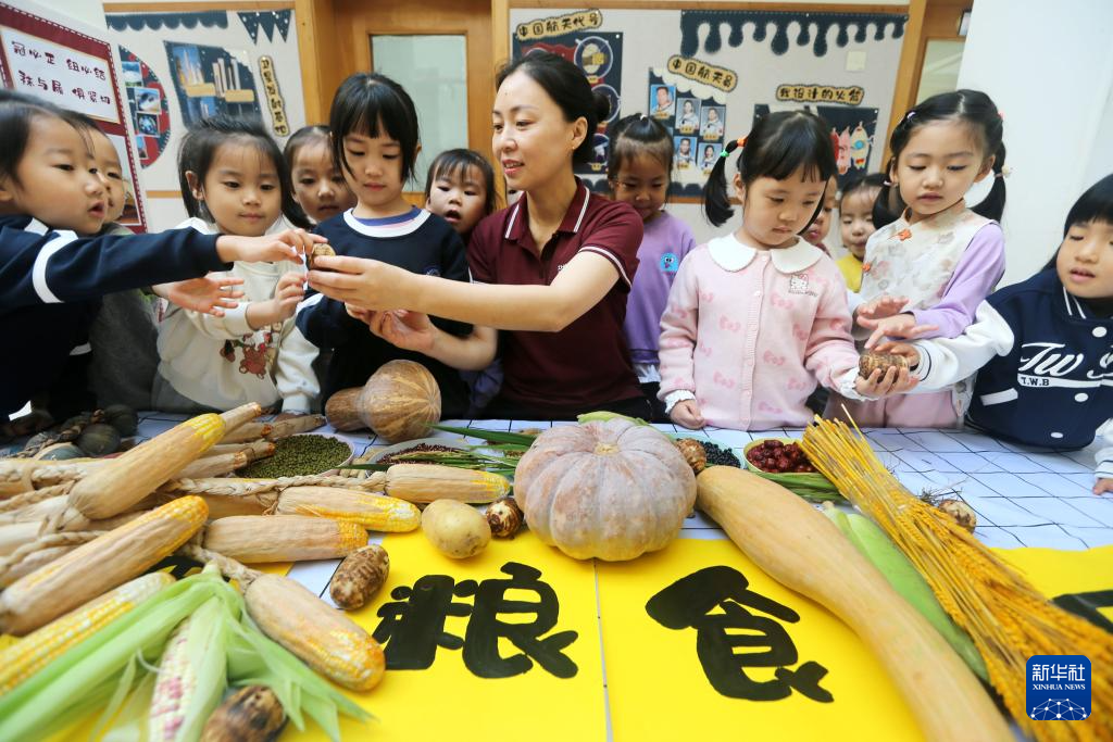 10月14日,在山东省临沂市沂南县孙祖镇中心幼儿园,老师带领孩子们学习粮食相关知识。