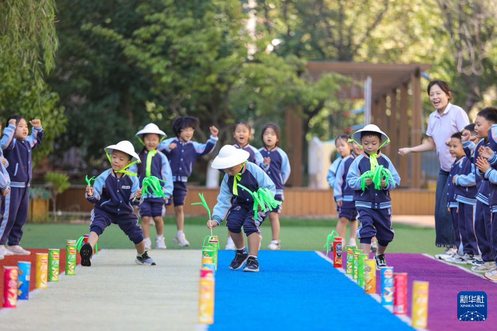 10月14日,在青岛市李沧区实验幼儿园,小朋友们进行“插秧”趣味比赛。