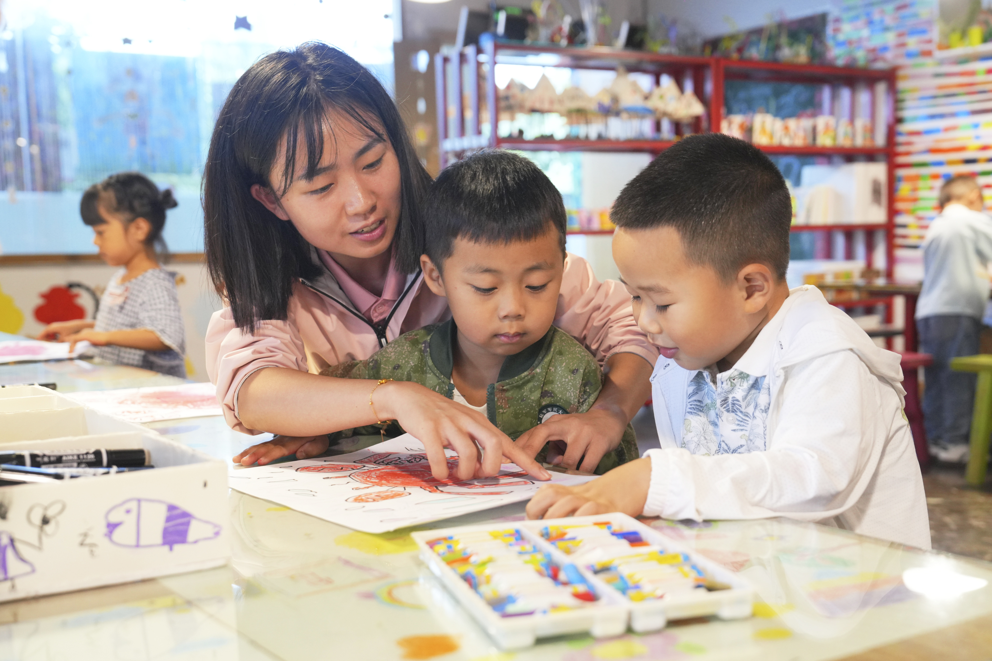 10月14日,在重庆市北碚区缙云幼儿园创意工作坊,孩子们在老师的指导下练习绘画。秦廷富 摄