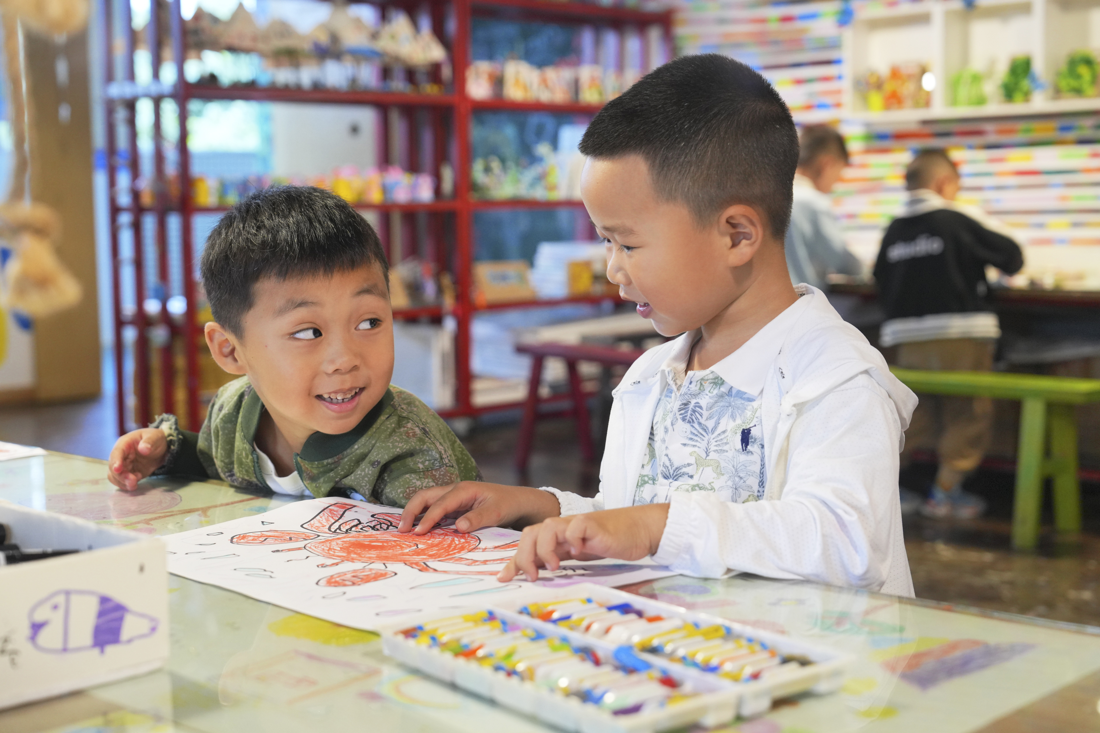 10月14日,在重庆市北碚区缙云幼儿园创意工作坊,孩子们在练习绘画。秦廷富 摄