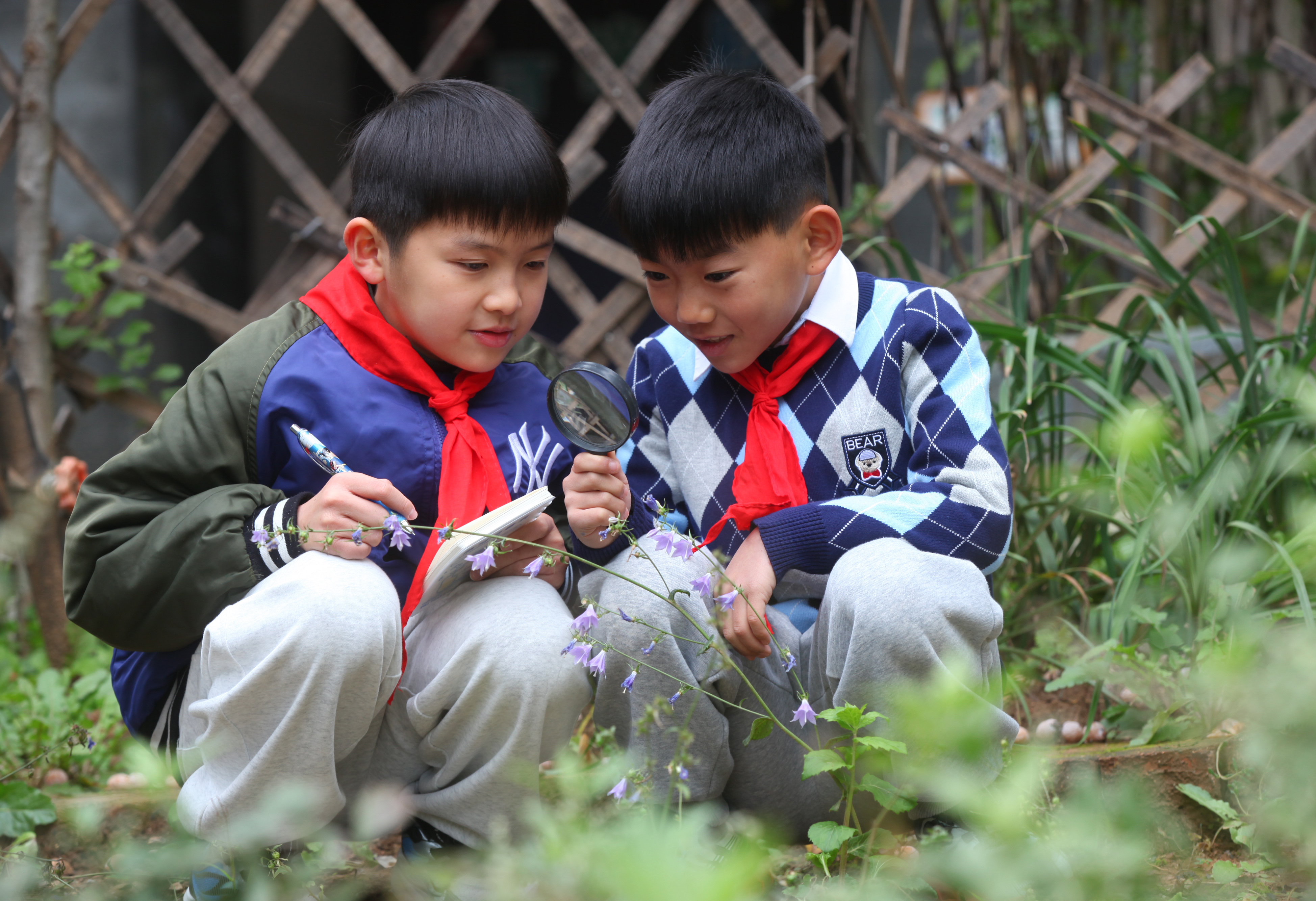 江苏省徐州市下淀小学的“百草园”里,学生在观察中药材生长情况和形态特征。通讯员 蒯创 摄