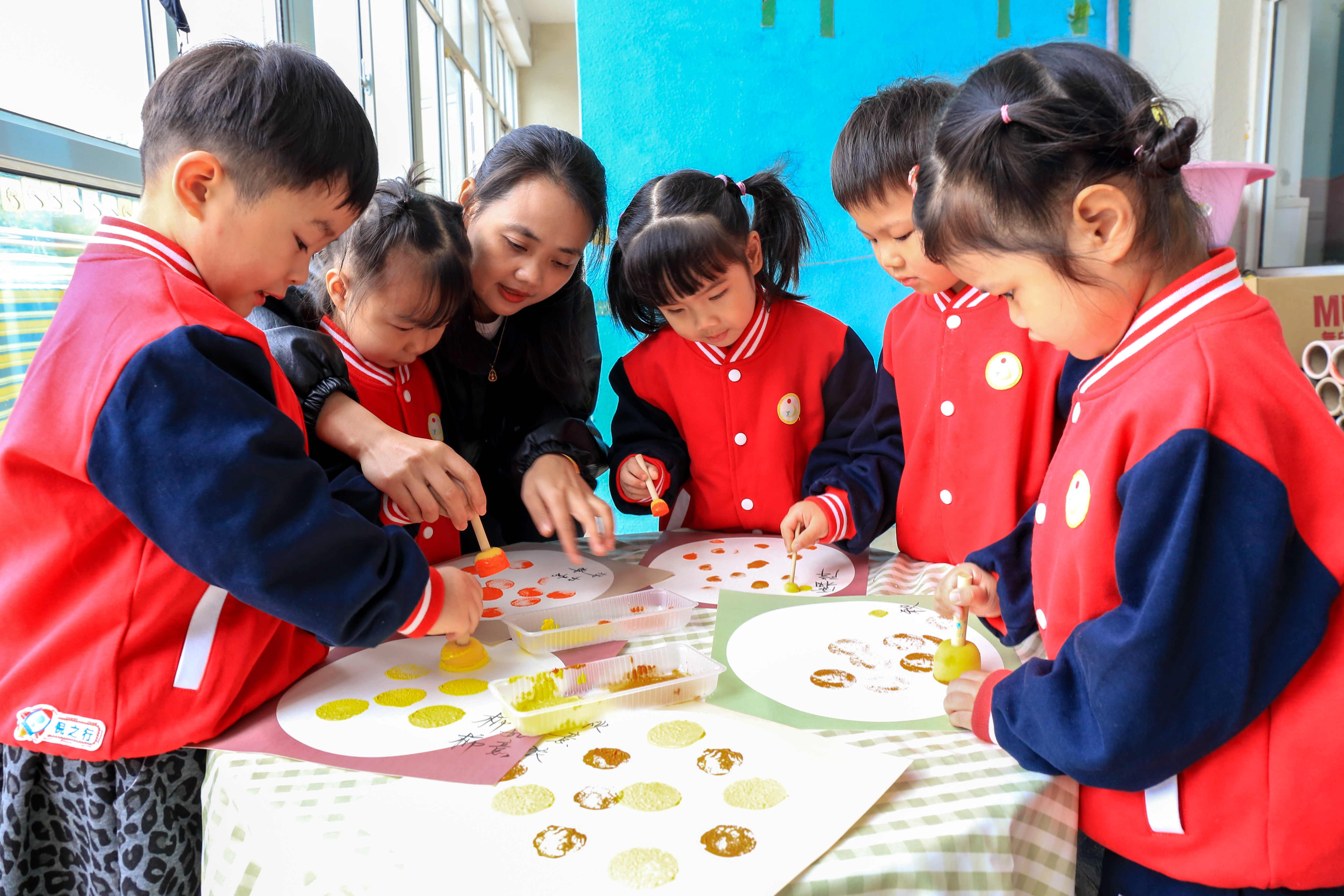 浙江省湖州市长兴县夹浦镇中心幼儿园,教师与孩子一起拓印“霜降”主题画。通讯员 谭云俸 摄