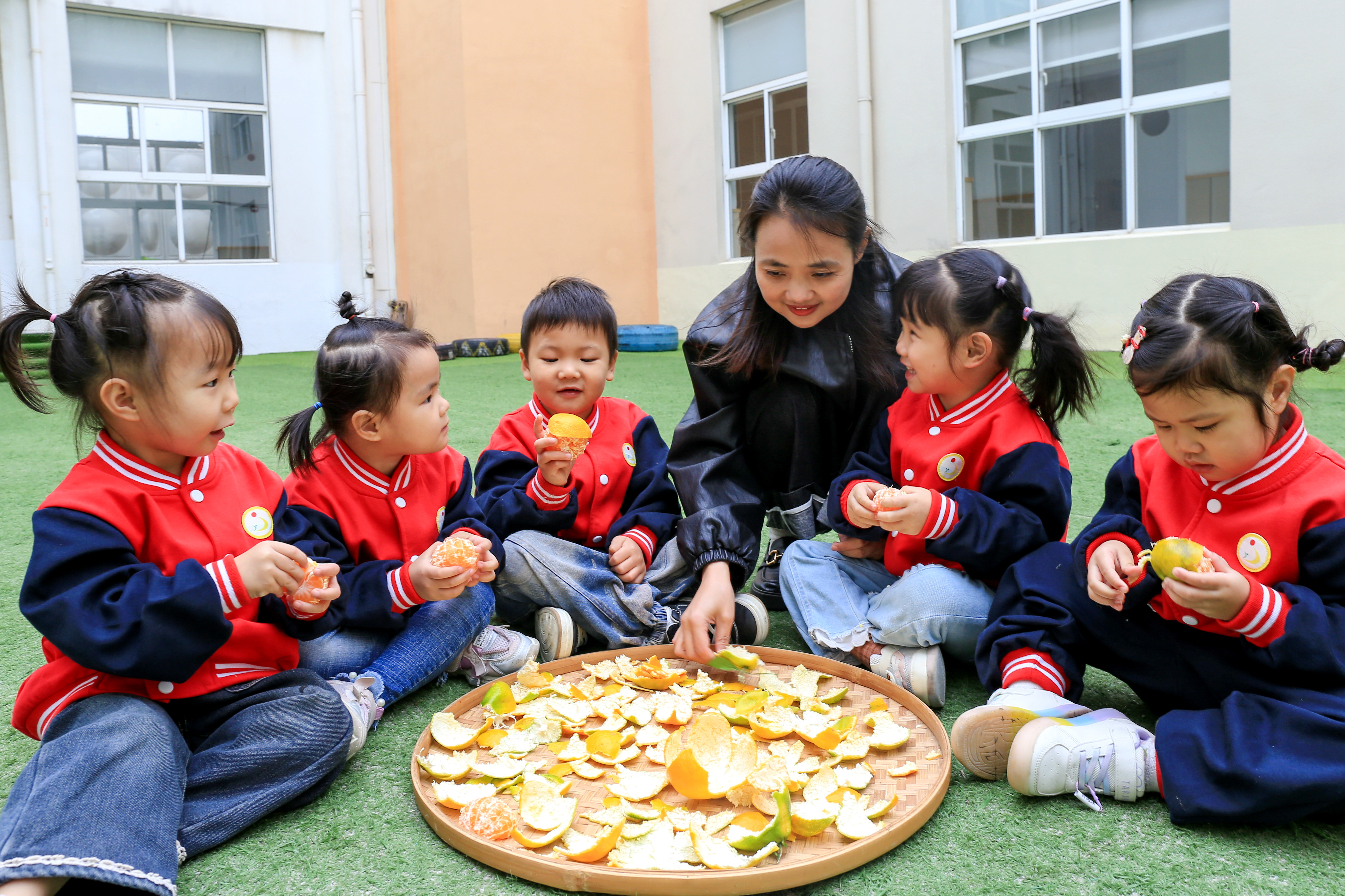 浙江省湖州市长兴县夹浦镇中心幼儿园,教师与孩子一起晒橘皮。通讯员 谭云俸 摄