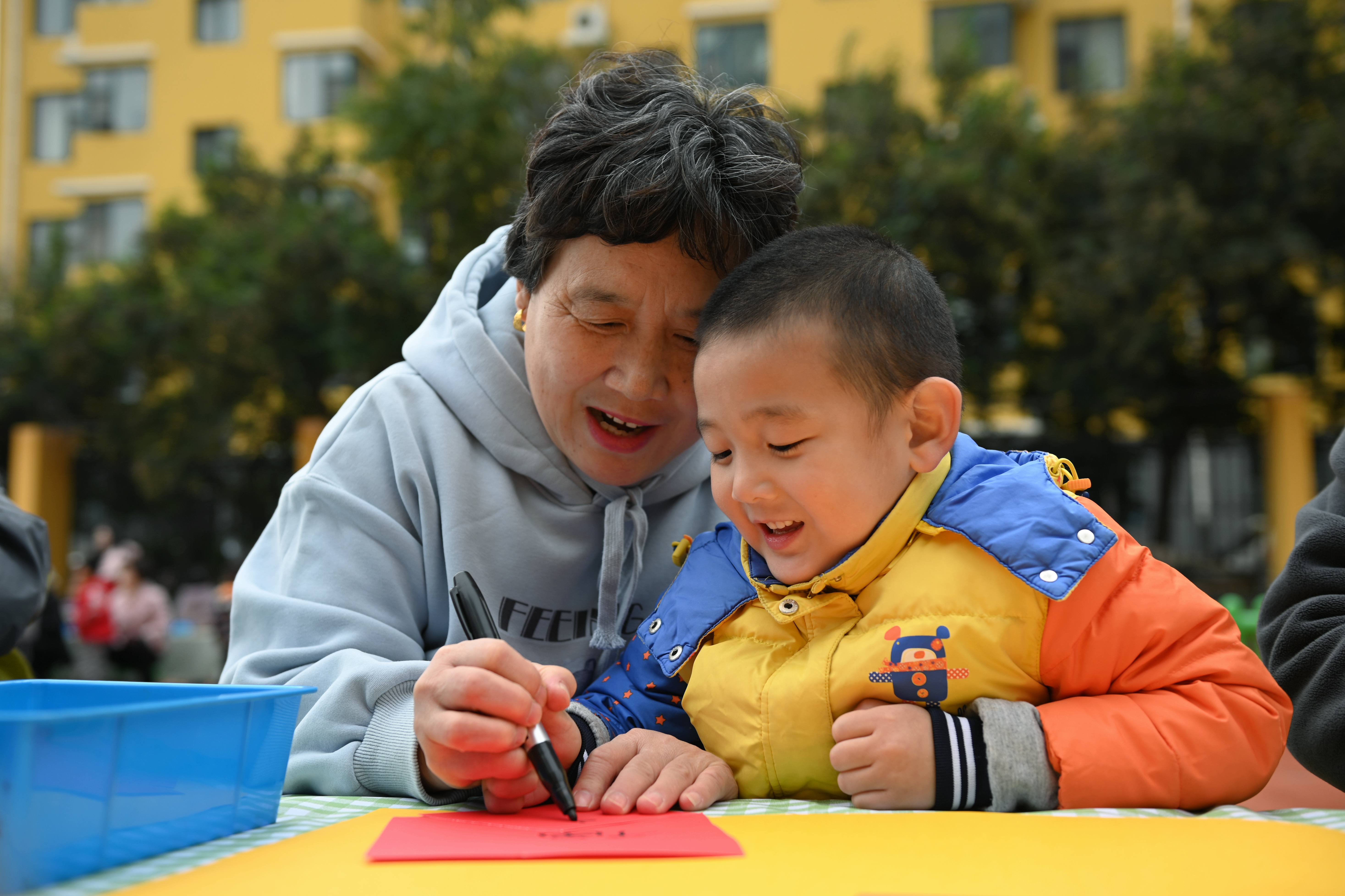 河北省邯郸市复兴区第一幼儿园,小朋友和长辈一起制作百福图。通讯员 周绍宗 摄