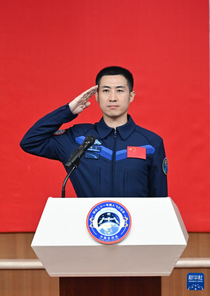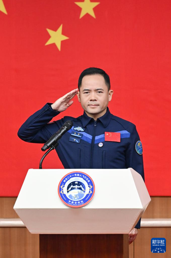 10月30日,神舟二十一号载人飞行任务航天员张陆、武飞、张洪章在酒泉卫星发射中心问天阁与媒体记者集体见面。这是航天员张陆与媒体记者见面。