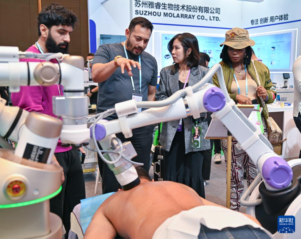 11月3日,客商在广交会展馆了解一款理疗机器人。