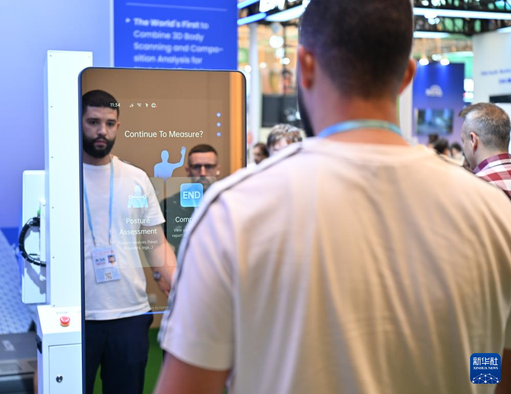 11月3日,客商在广交会展馆体验一款智能身体测量产品。