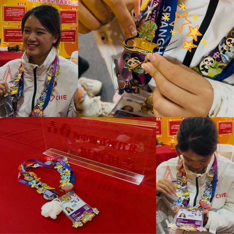 对她而言,进博会不仅是服务平台,更是情感交流的港湾。她珍爱交换来的各式徽章,其中那枚国展中心金色徽章尤为特别。“这枚徽章很稀有。”她回忆道,“当时和我交换徽章的那位工作人员姐姐笑着说:‘港澳台的小叶子,就是要宠着!’这句话让我感到特别温暖。”一枚小小的徽章,一句暖心的话语,成了珍贵情谊最生动的诠释。