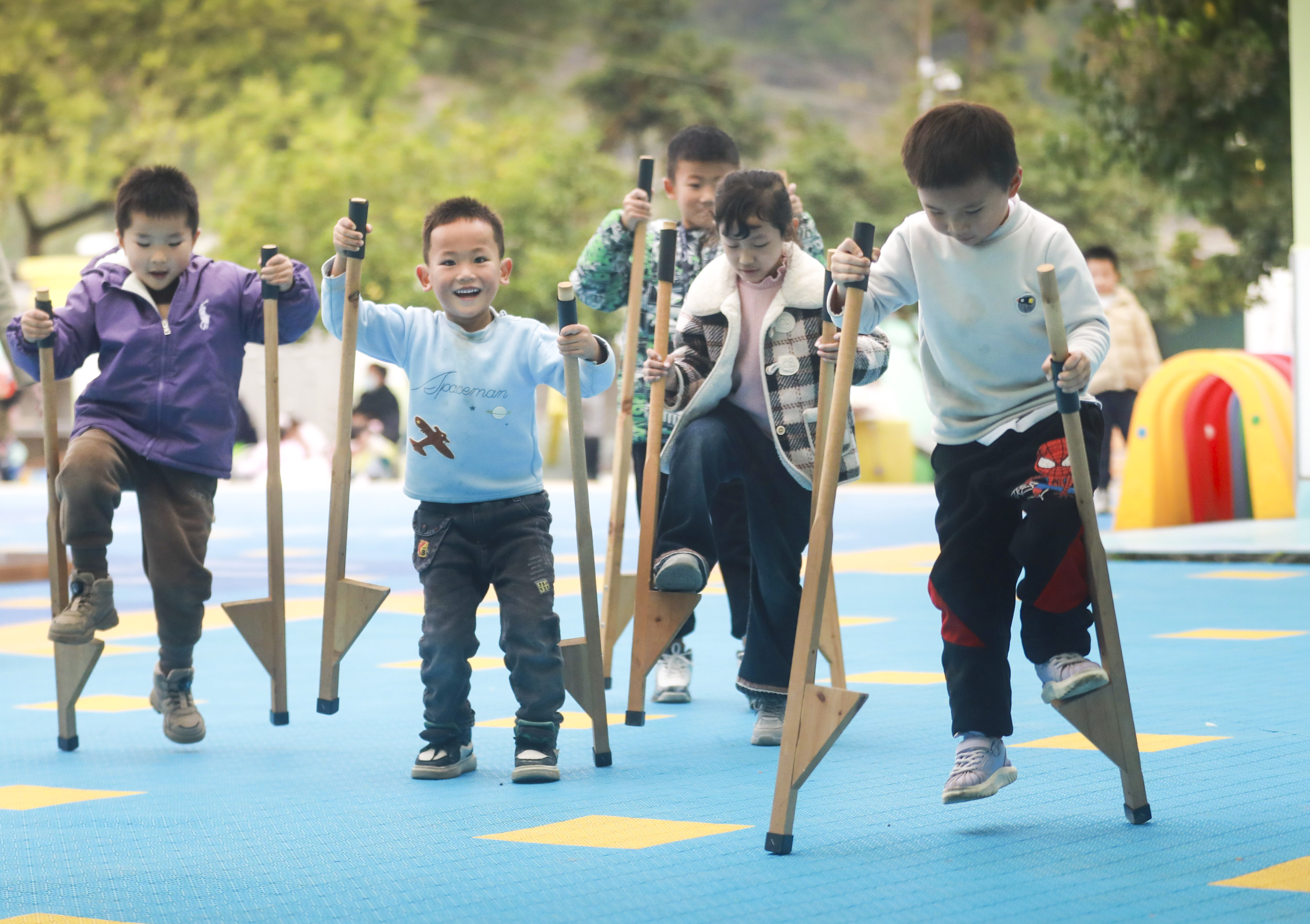 贵州省黔西市永燊彝族苗族乡中心幼儿园的孩子们在进行踩高跷比赛。通讯员 周训超 摄