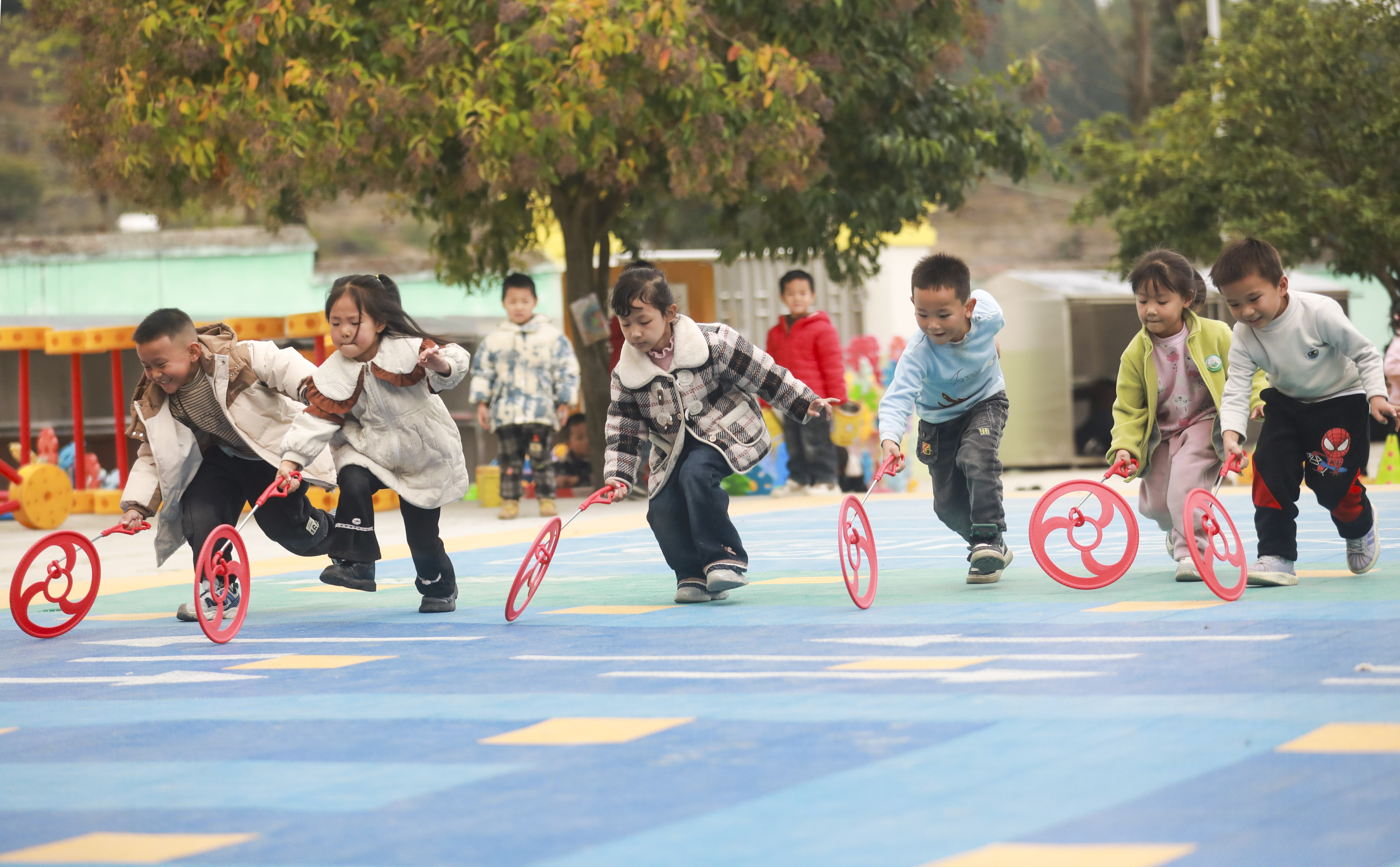 贵州省黔西市永燊彝族苗族乡中心幼儿园的孩子们在进行滚铁环比赛。通讯员 周训超 摄