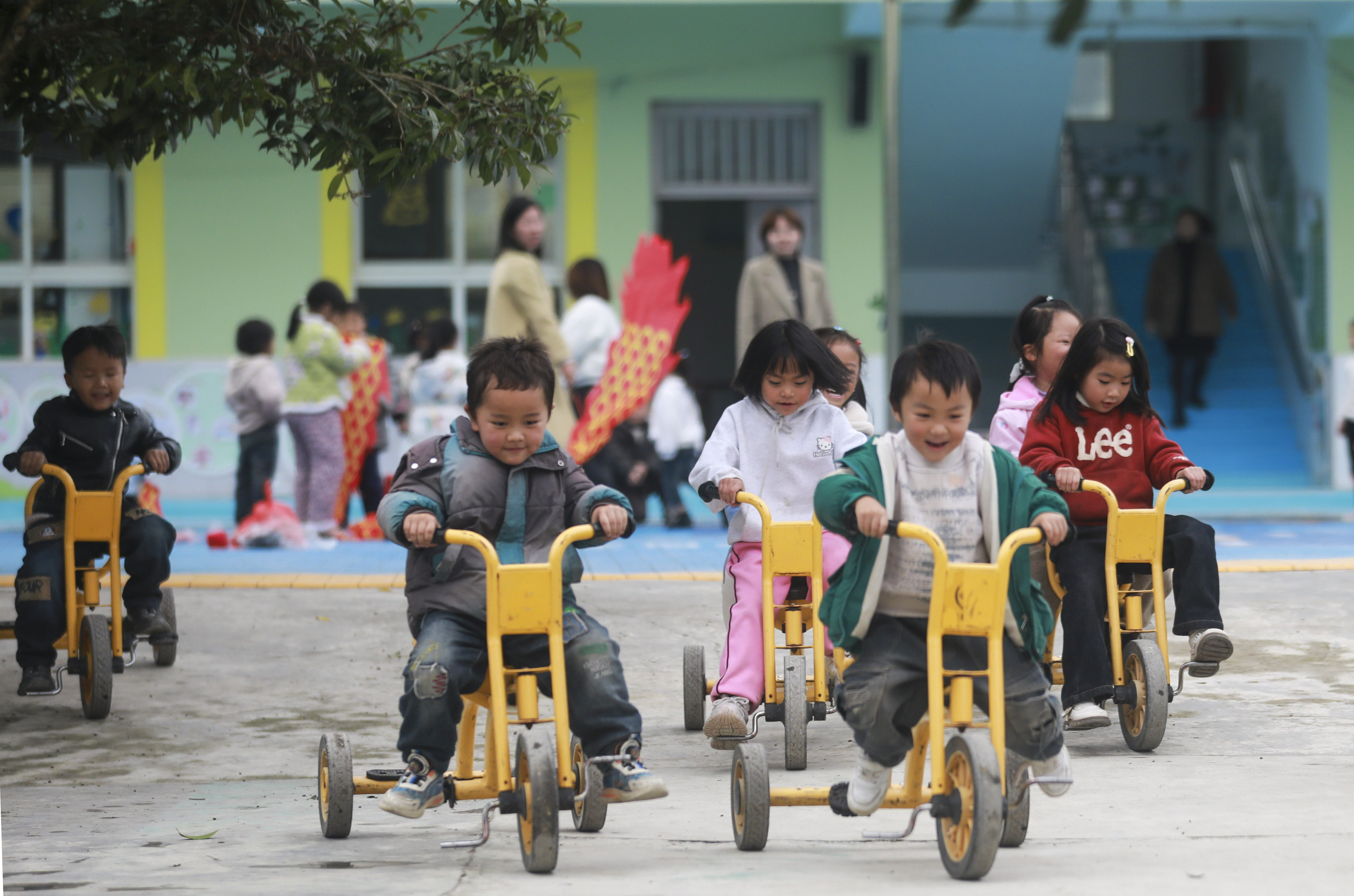 贵州省黔西市永燊彝族苗族乡中心幼儿园的孩子们在进行骑三轮车比赛。通讯员 周训超 摄