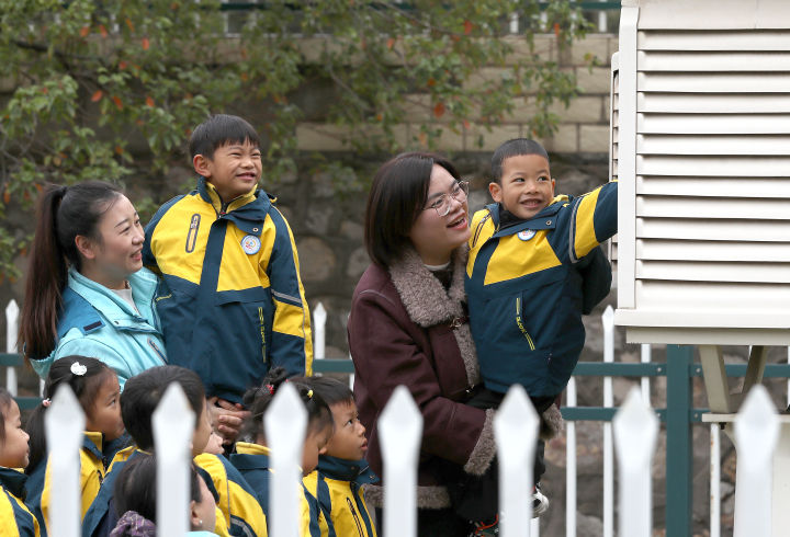 图为2025年11月18日,在湖北省荆门市气象局,漳河新区双喜街道中心幼儿园的孩子们在工作人员引导下,好奇地观察雨量计,了解降水知识。
