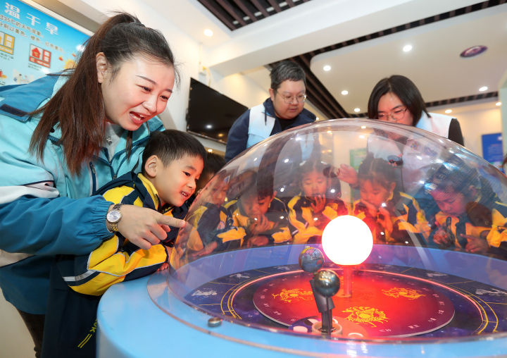 图为2025年11月18日,在湖北省荆门市气象局,漳河新区双喜街道中心幼儿园的孩子们通过三球仪,直观感受地球自转公转形成的昼夜交替与四季更迭规律。