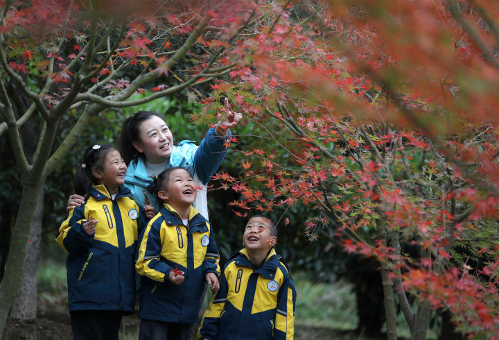 图为2025年11月18日,在湖北省荆门市植物园,漳河新区双喜街道中心幼儿园的老师带领孩子们观察红叶形态,感知自然节律与季节变化。
