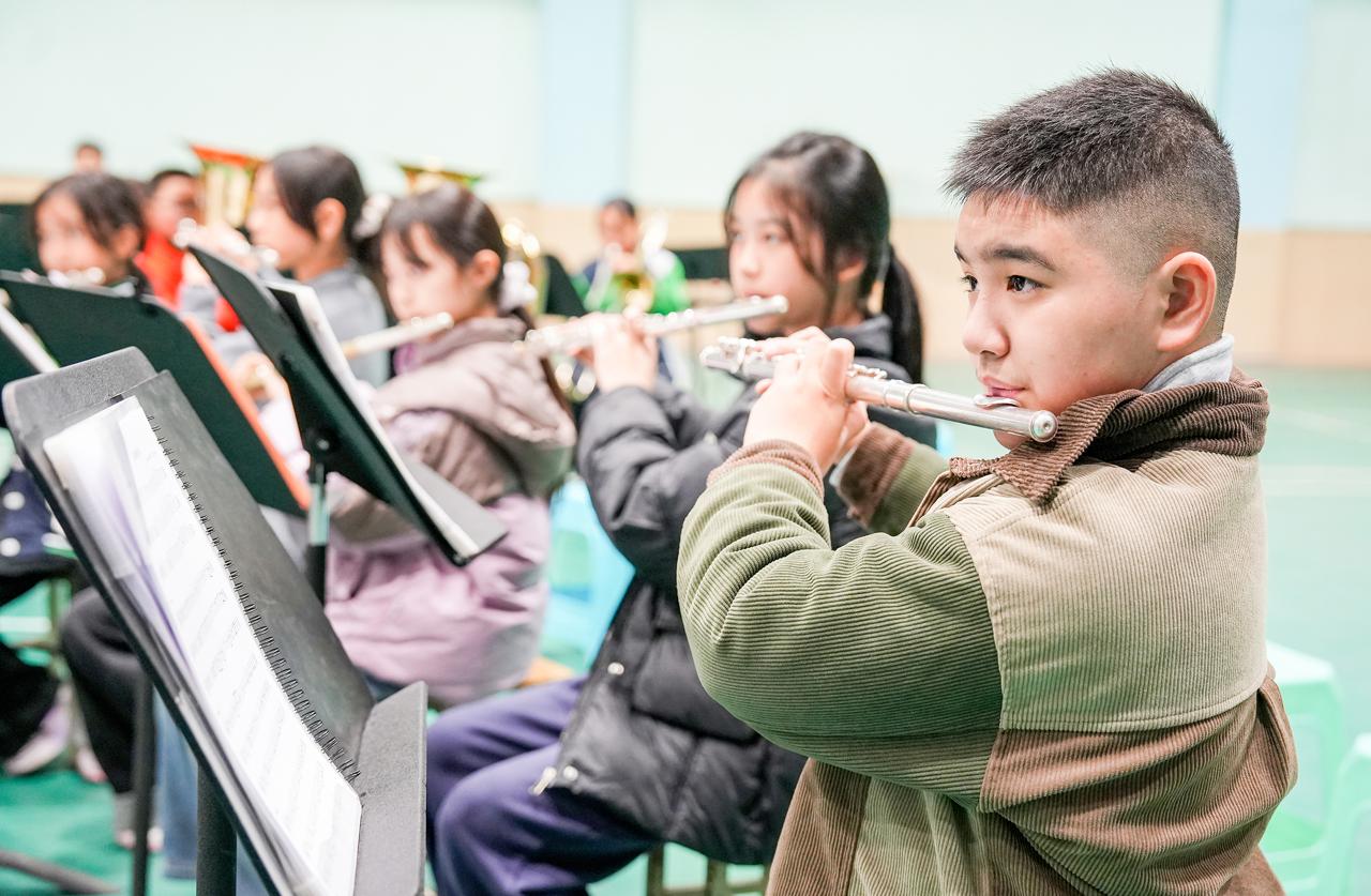 11月16日,四川省华蓥市双河小学“娃娃管乐团”的学生在练习长笛。邱海鹰 刘南贤 摄