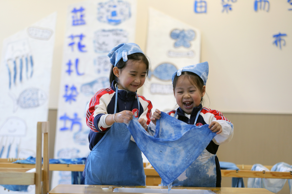 11月19日,四川省乐山市实验幼儿园至乐分园,小朋友们正在体验非遗扎染技艺。通讯员 李华时 马露 摄