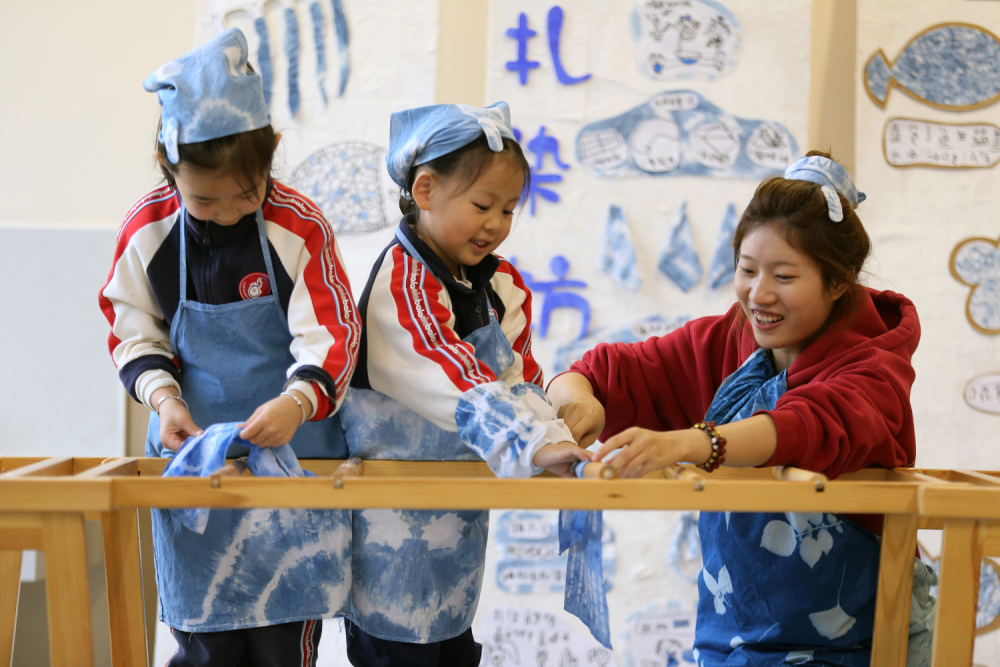 2025年11月19日,在世界儿童日来临之际,四川省乐山市实验幼儿园至乐分园开展“乐学扎染 感受非遗”活动,老师指导孩子们体验扎染制作技艺,了解非遗知识,感受中华优秀传统文化的魅力。中国教育报通讯员 李华时 马露 摄