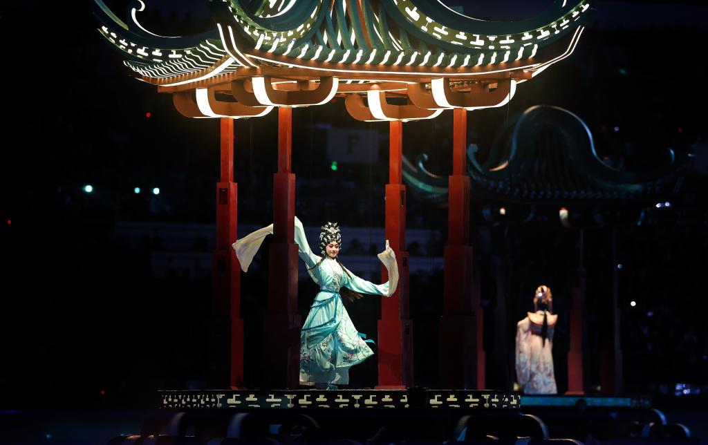 ↑11月9日,粤剧演员在开幕式现场表演。新华社记者 杨冠宇 摄