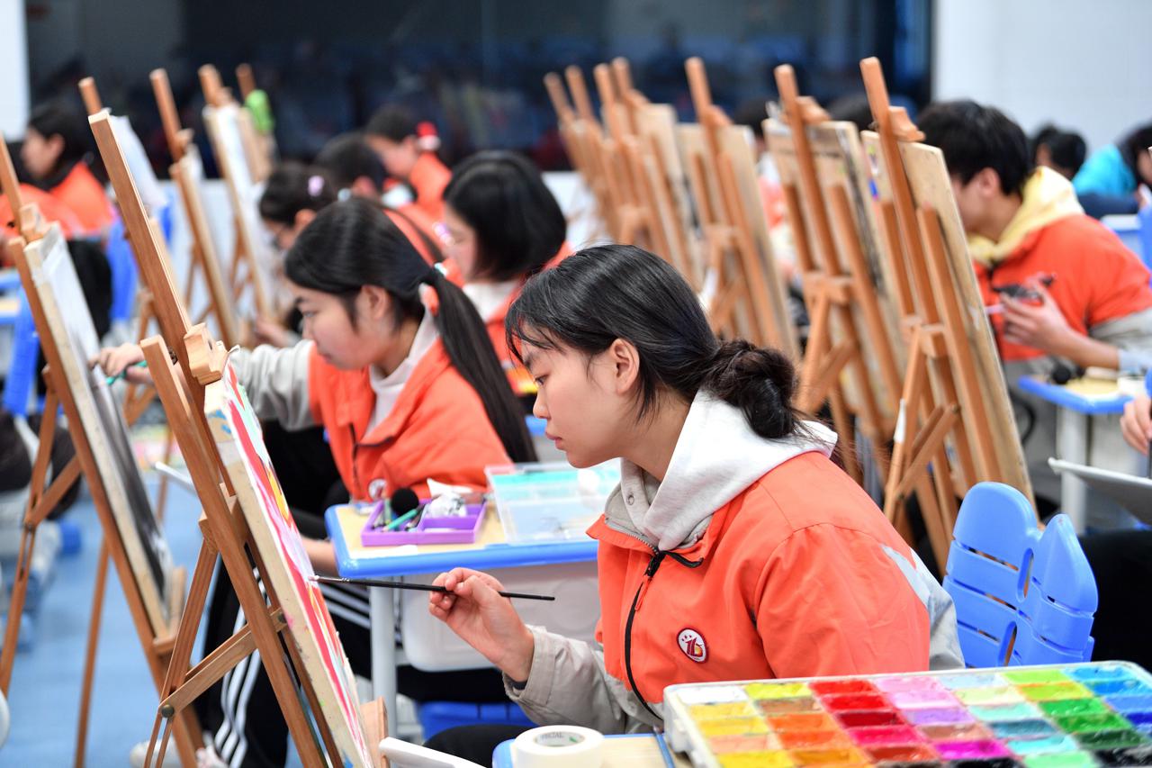 11月18日,湖北省襄阳市保康县后坪镇中心学校,学生们参加高中组绘画比赛。杨韬 宋兴虎 摄
