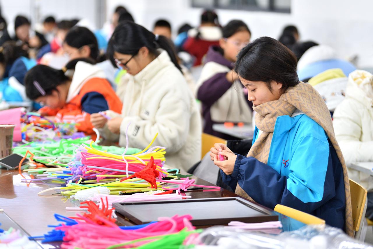 11月18日,湖北省襄阳市保康县后坪镇中心学校,学生们参加手工制作比赛。杨韬 宋兴虎 摄