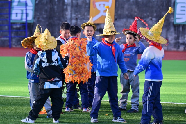 11月21日,湖北省十堰市竹山县恒升小学“快乐成长工程”暨第八届体育文化节开幕式上,学生身着用银杏叶、枫叶、金菊等材料制作的服饰集体亮相,惊艳校园。中国教育报-中国教育新闻网通讯员 石濡华 郭莹莹 摄