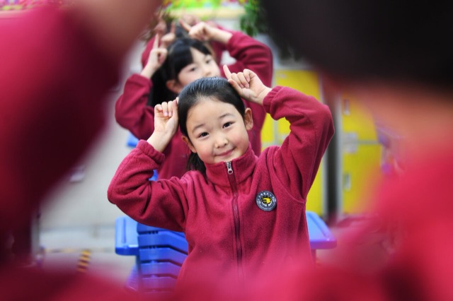 学生正在老师指导下学习“课桌舞”。通讯员 赵松 摄