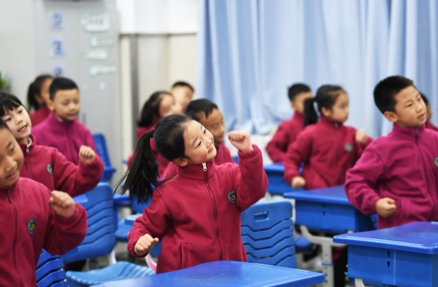 学生在教室里练习“课桌舞”。通讯员 赵松 摄