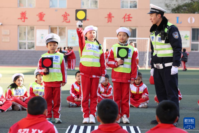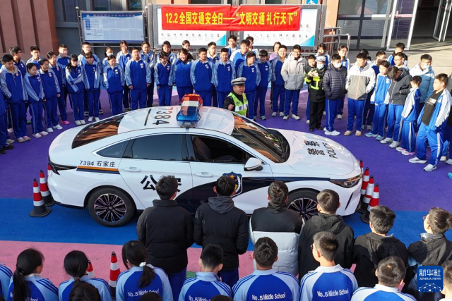 12月2日,在河北省石家庄新乐市实验小学,民警给学生普及交通避险知识。新华社发(贾敏杰摄)