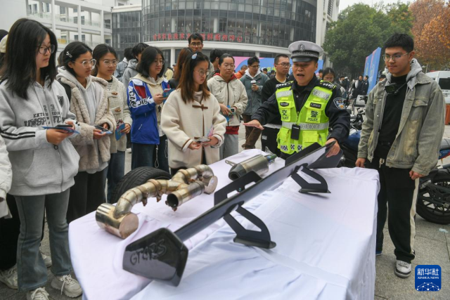 12月2日,浙江省金华职业技术大学校园,一名辅警给学生介绍非法改装车的危害。新华社发(时宽兵摄)